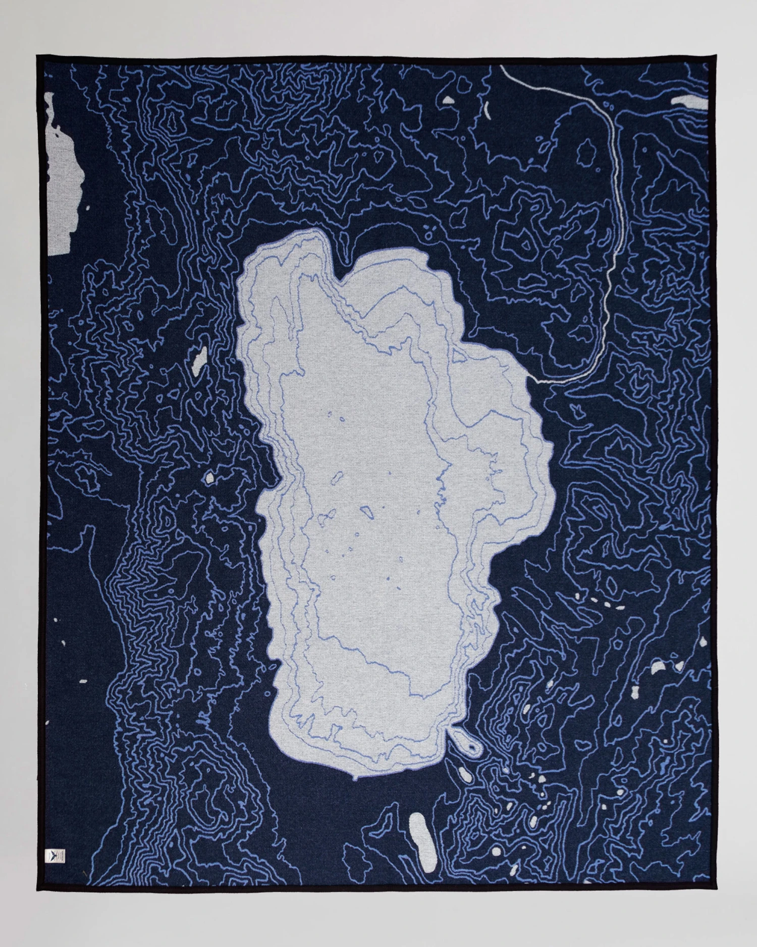A woven-in USA wool jacquard blanket representing more than 1,000 square miles of the Lake Tahoe region of California and Nevada, based on topographic data. At the center is Lake Tahoe, in a brilliant blue with bathymetric lines showing its spectacular depth. This blanket also celebrates the topography of the region’s mountains, stretching from Mt. Rose at the north to Mt. Tallac at the south. Created in conjunction with North Drinkware®.
