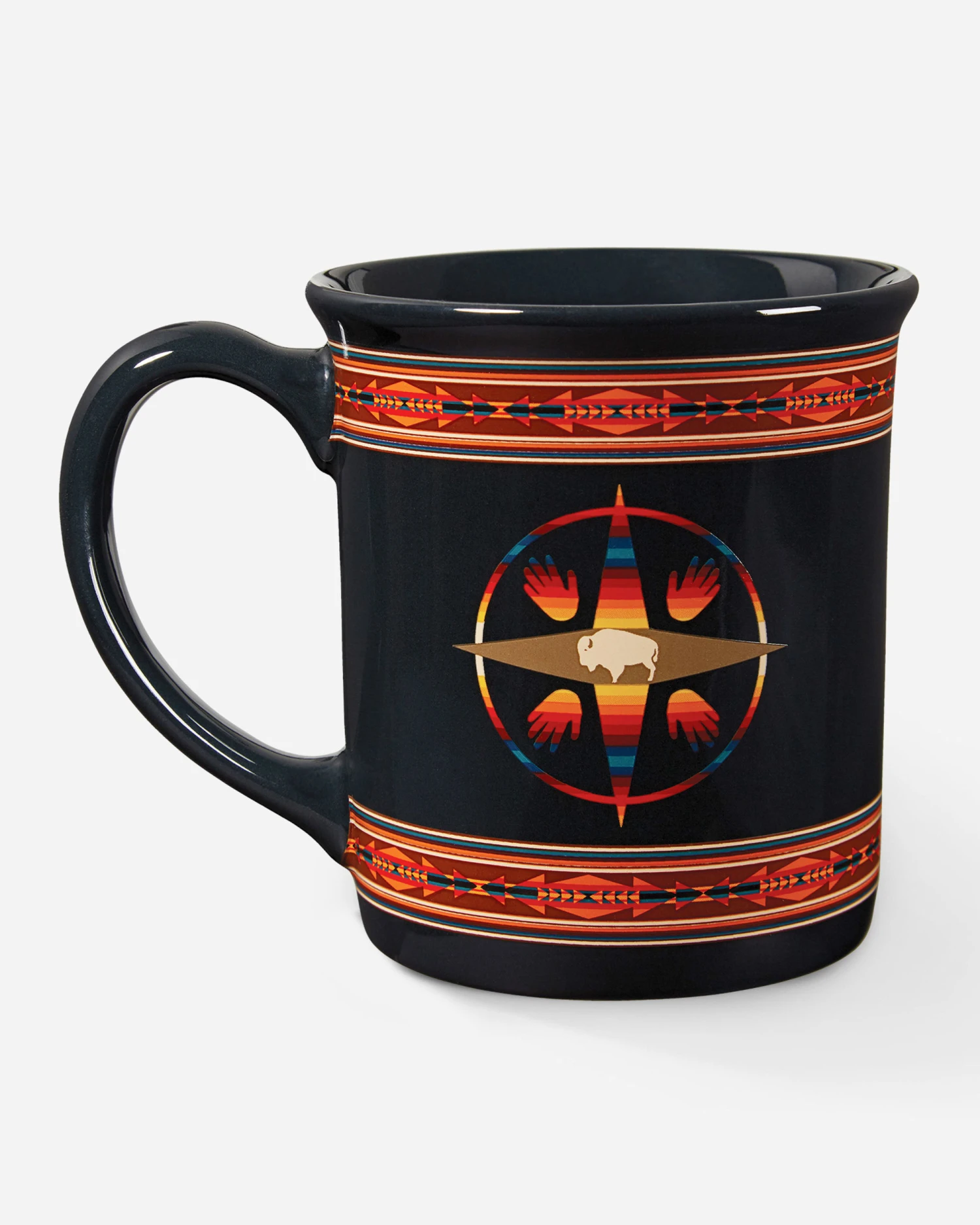 Generously sized ceramic mug is perfect for everything from coffee and cocoa to soup and cereal. Sturdy, durable and sure to be a favorite for years. Based on our Big Medicine blanket pattern (item 71499) honoring the sacred power of the rare white buffalo. Gift boxed.
