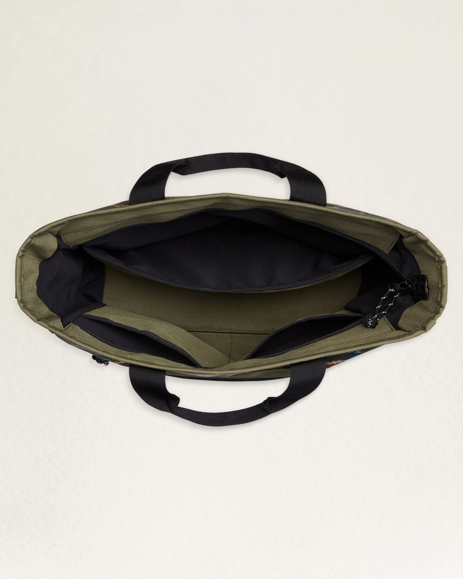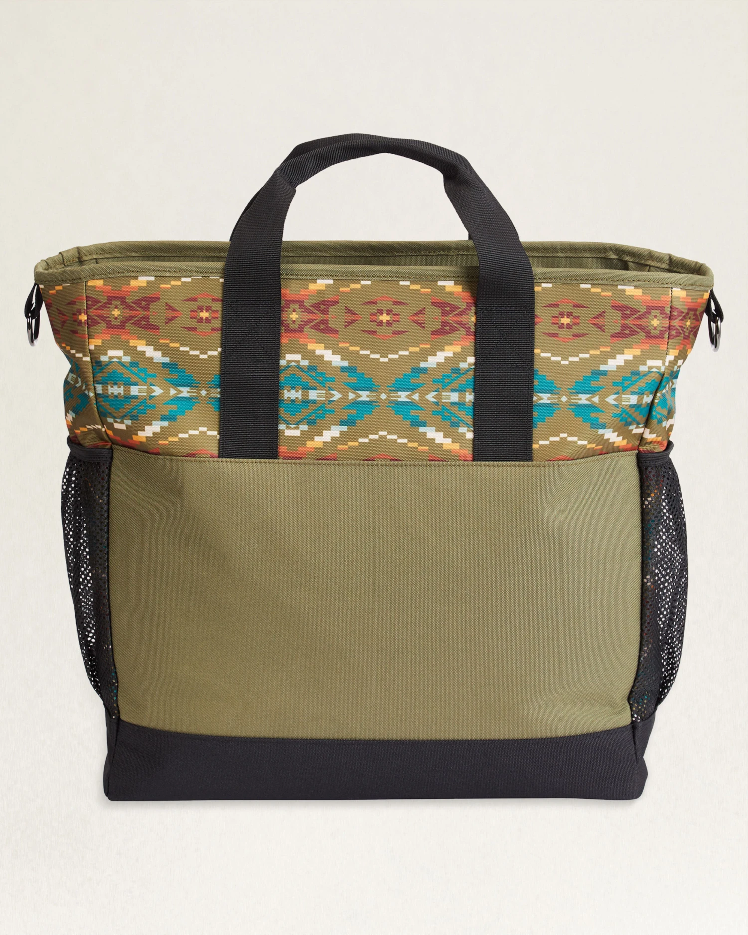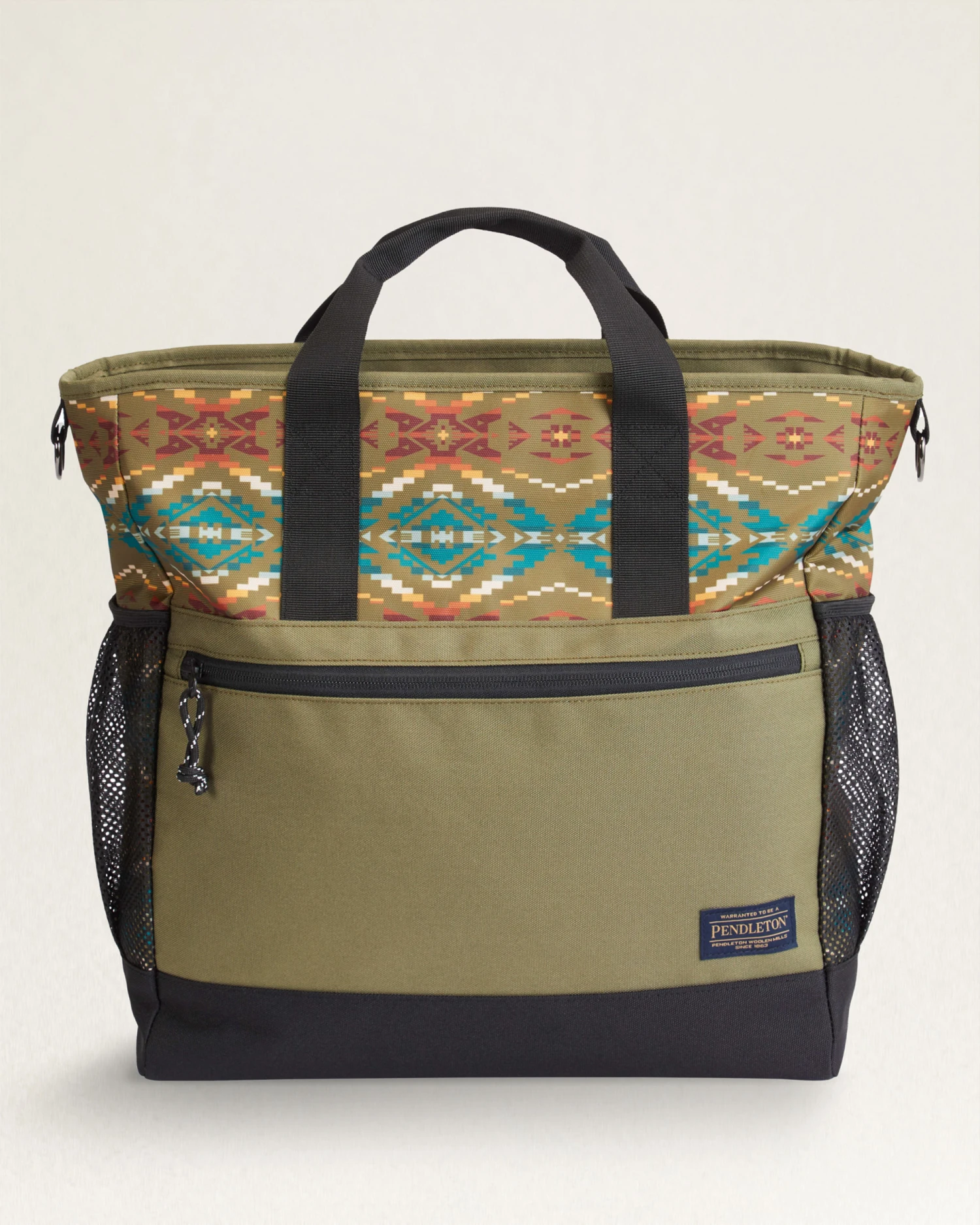 Zip-top tote bag with multiple pockets inside and out. Exterior has a large zip-close pocket plus two mesh side pockets for water bottles or a small umbrella; roomy interior has numerous pockets to stow and organize small items. Crafted from durable, wipe-clean polyester. Top handle, adjustable/removable shoulder strap. Pattern placement may vary.