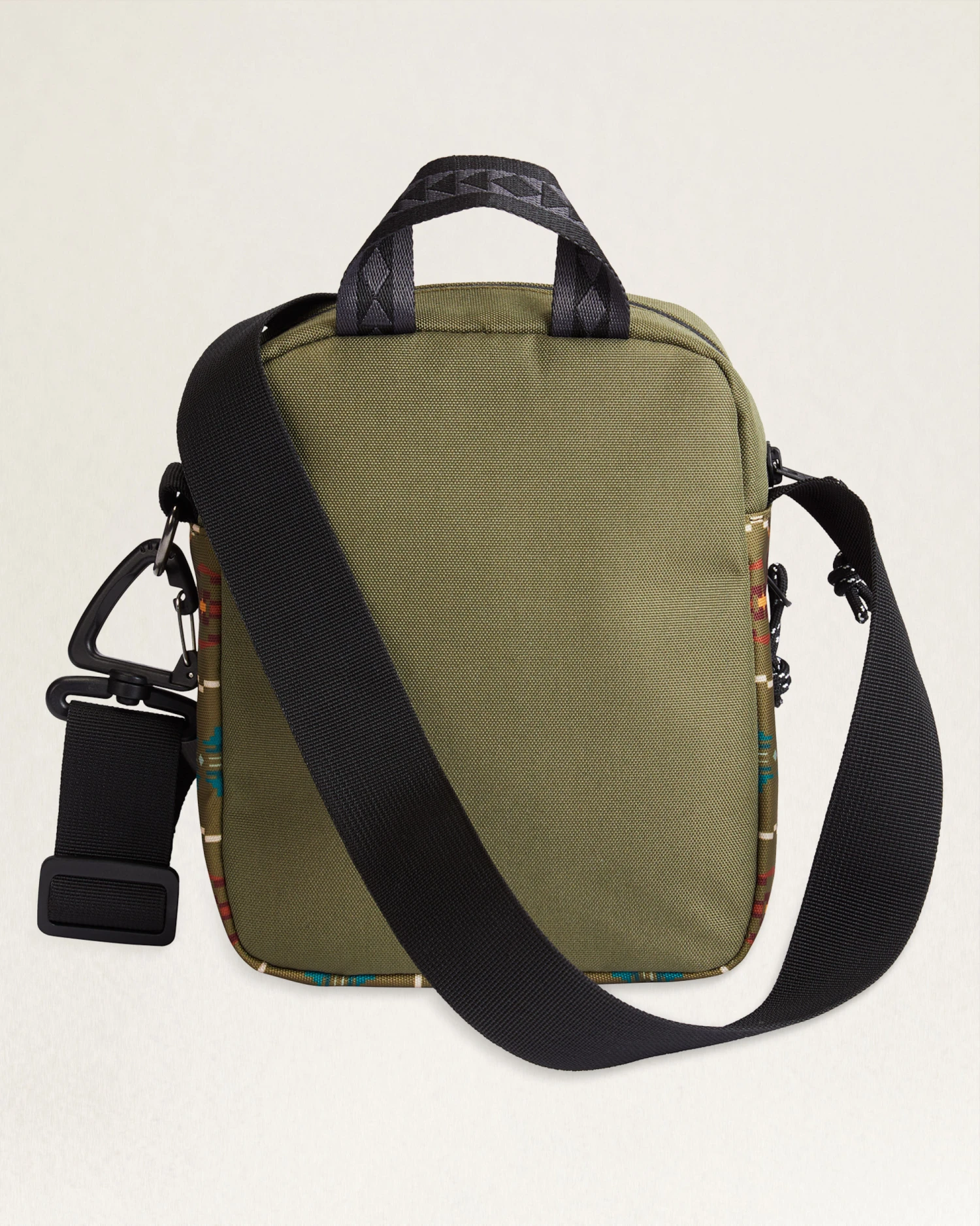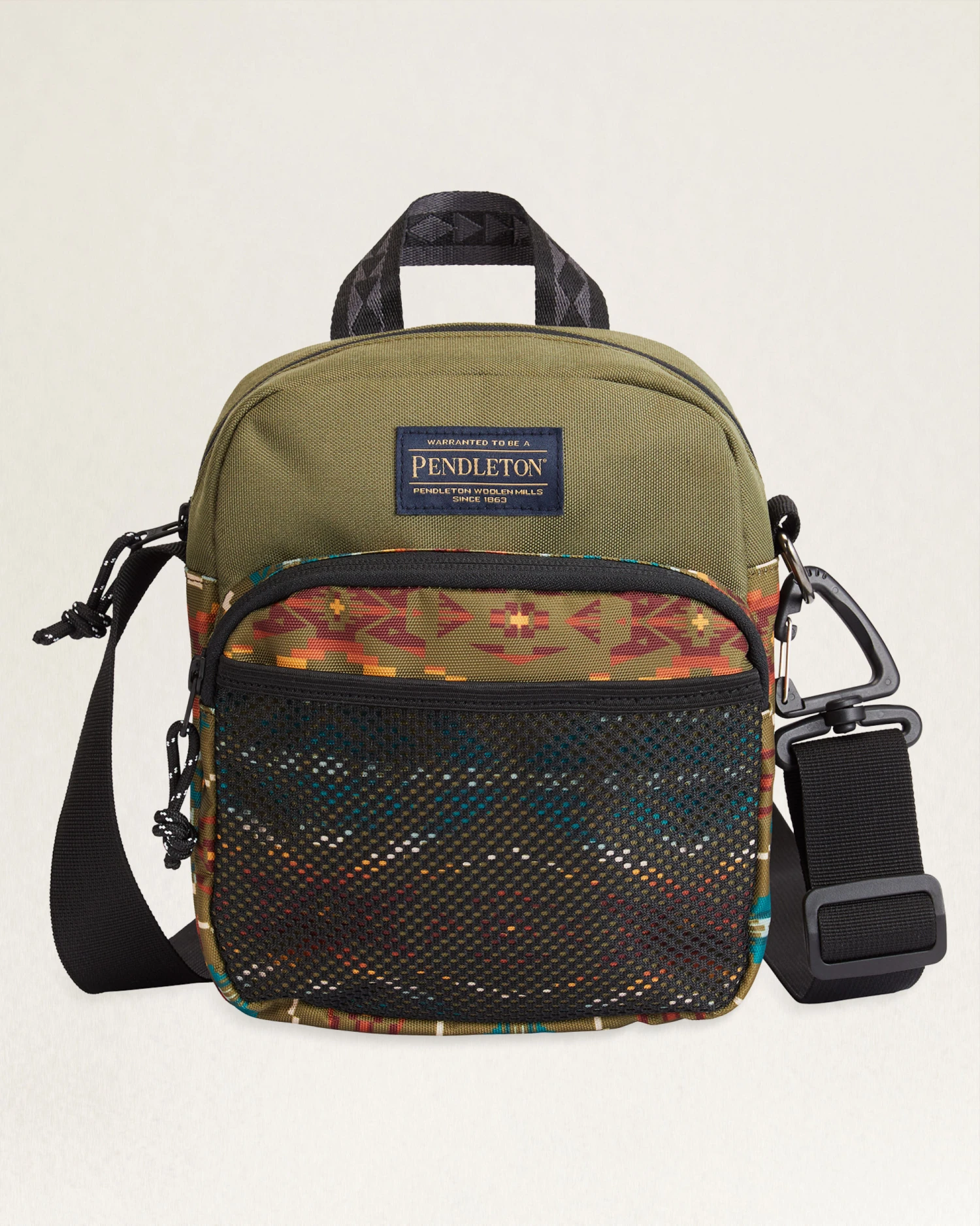 Compact zip-top crossbody bag constructed from sturdy polyester with a top grab handle and adjustable/removable shoulder strap. Exterior has a zip pocket plus a mesh pocket; interior has multiple pockets. Pattern placement may vary.