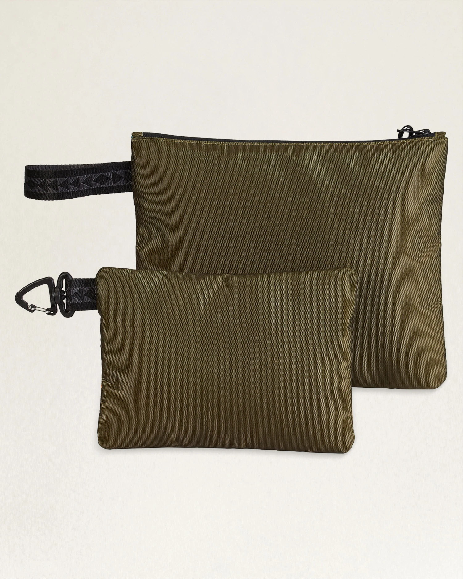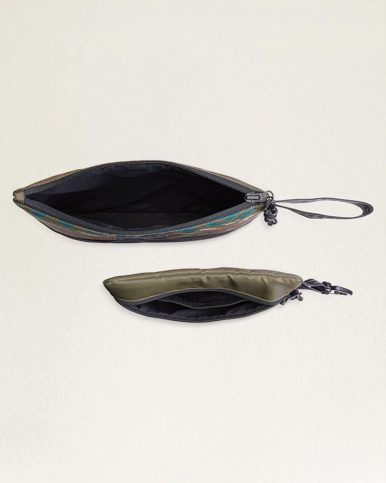 Set of two slim pouches perfect for keeping small items organized and easily accessible. Each pouch has a zip top and exterior pocket; a D-ring allows you to attach pouches together. Pattern placement may vary.