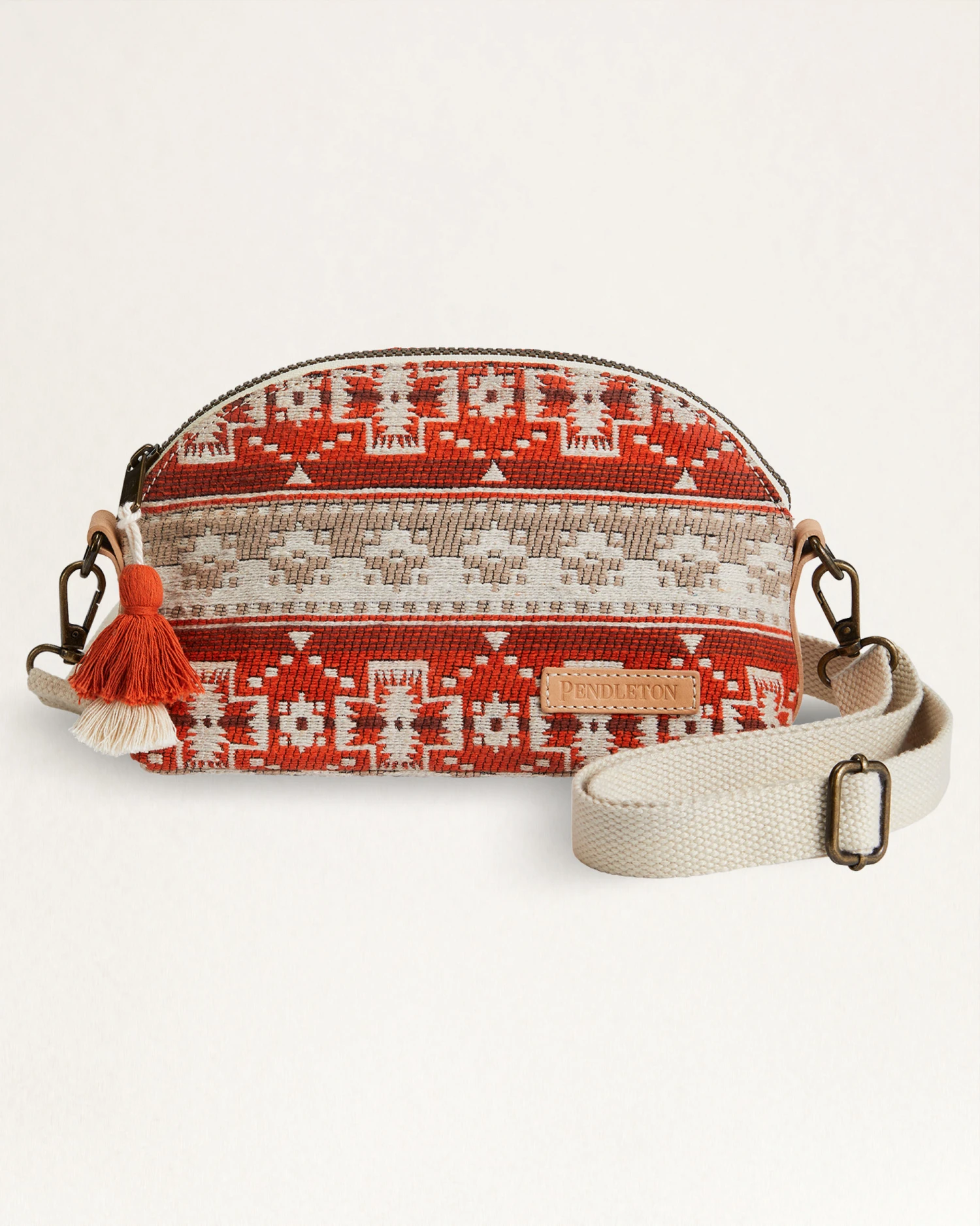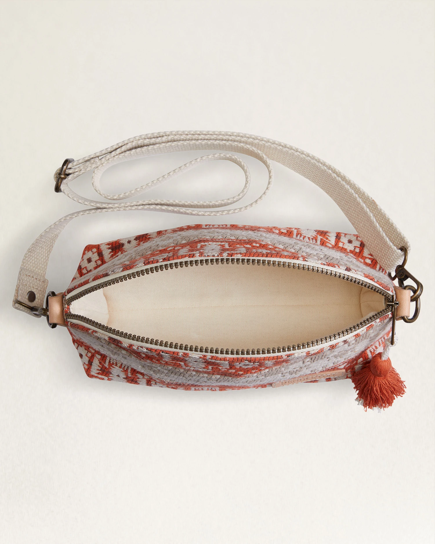 A compact zip-top crossbody bag constructed from a sturdy cotton and polyester blend with cotton lining. Features an adjustable and removable crossbody strap and decorative tassel.