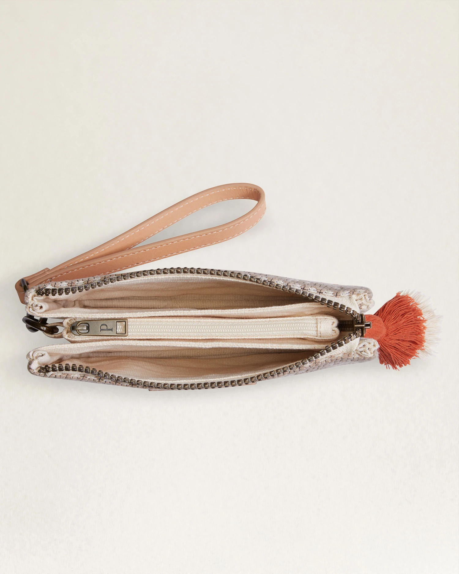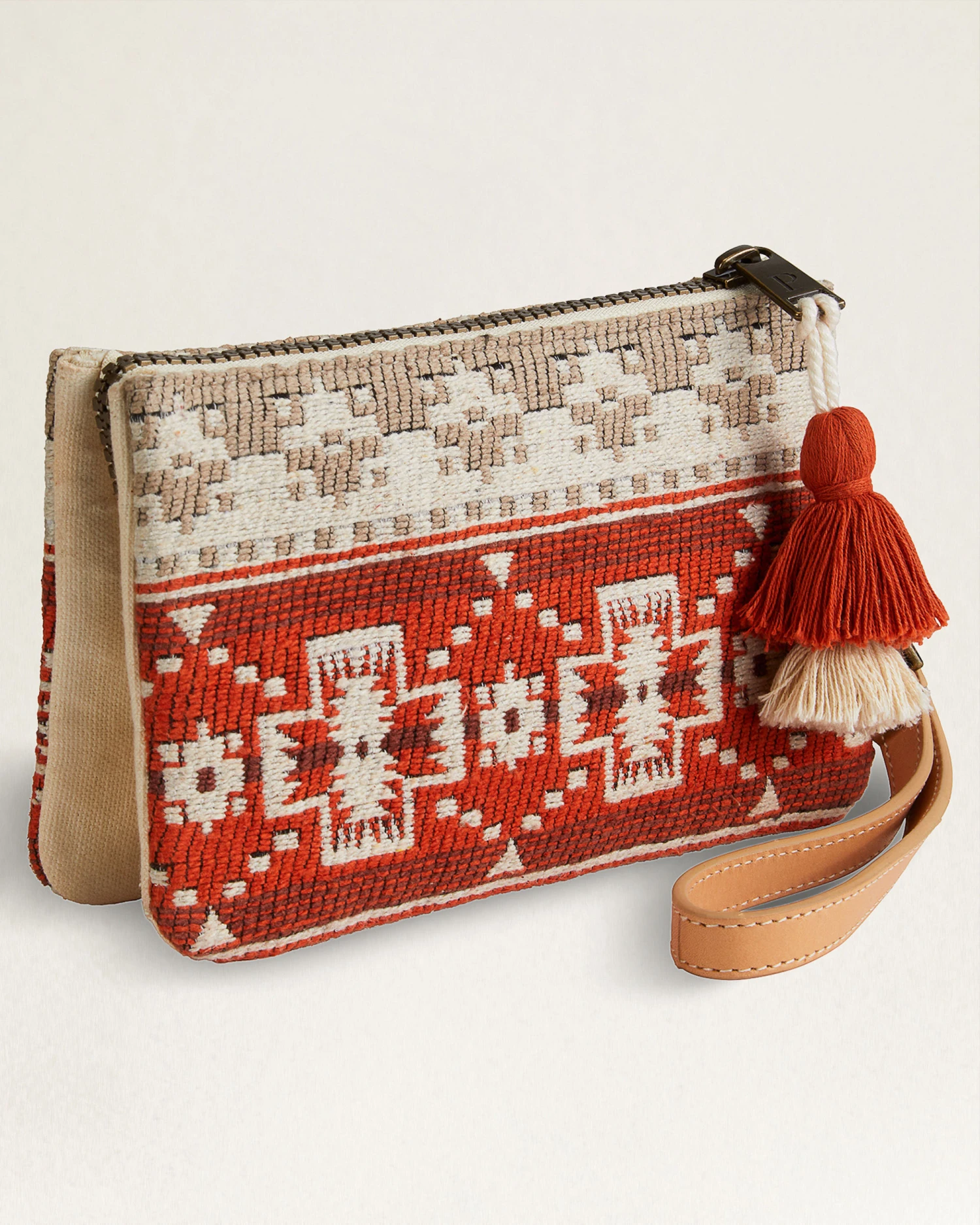 A compact zip-top pocket pouch constructed from a sturdy cotton and polyester blend with cotton lining. Features a removable wrist strap and decorative tassel.