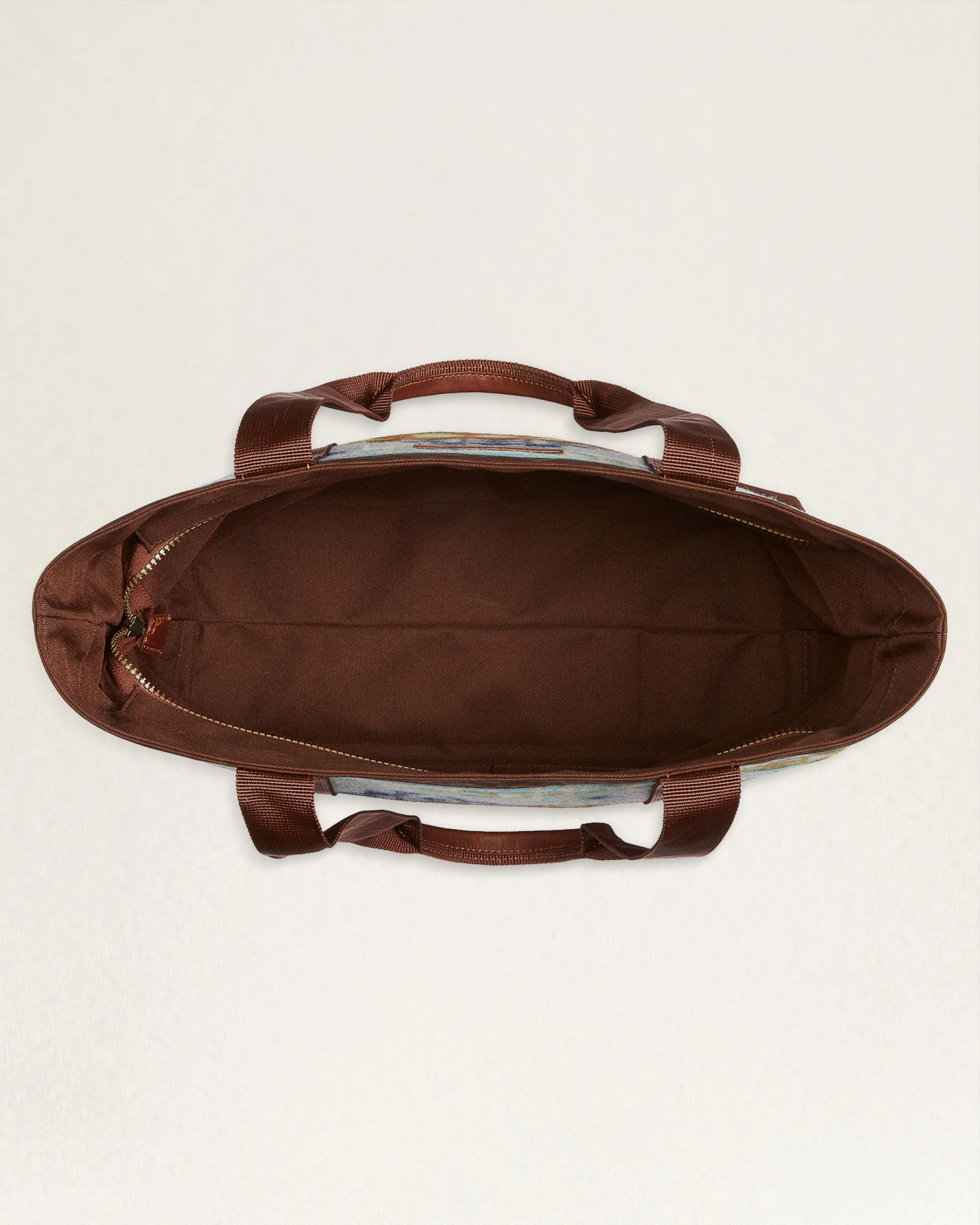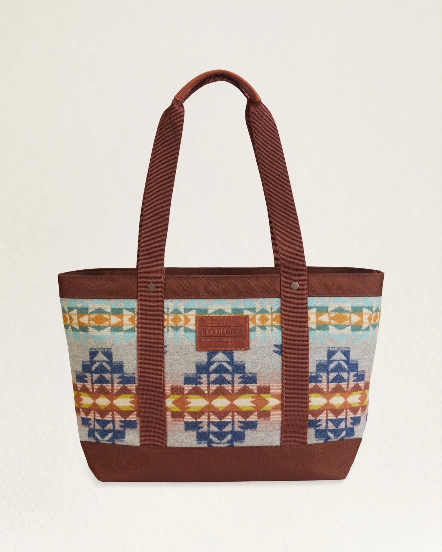 A versatile tote bag crafted from our USA-woven wool jacquard fabric in a pattern that represents the four desert regions of the American Southwest. Zip-top closure, interior slip pockets, antiqued brass hardware. Trimmed in durable polyester canvas with leather-trimmed dual handles. Pattern placement may vary.
