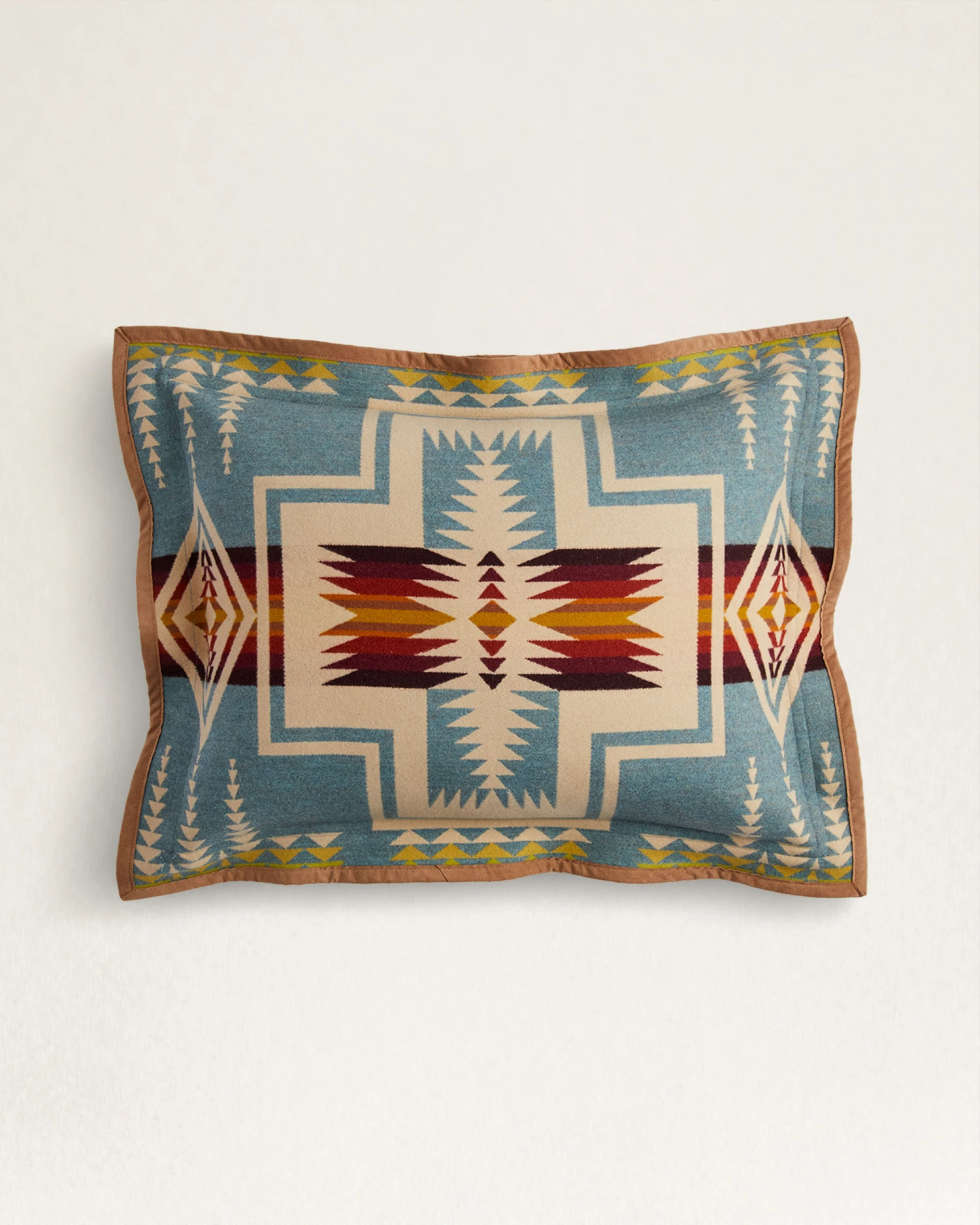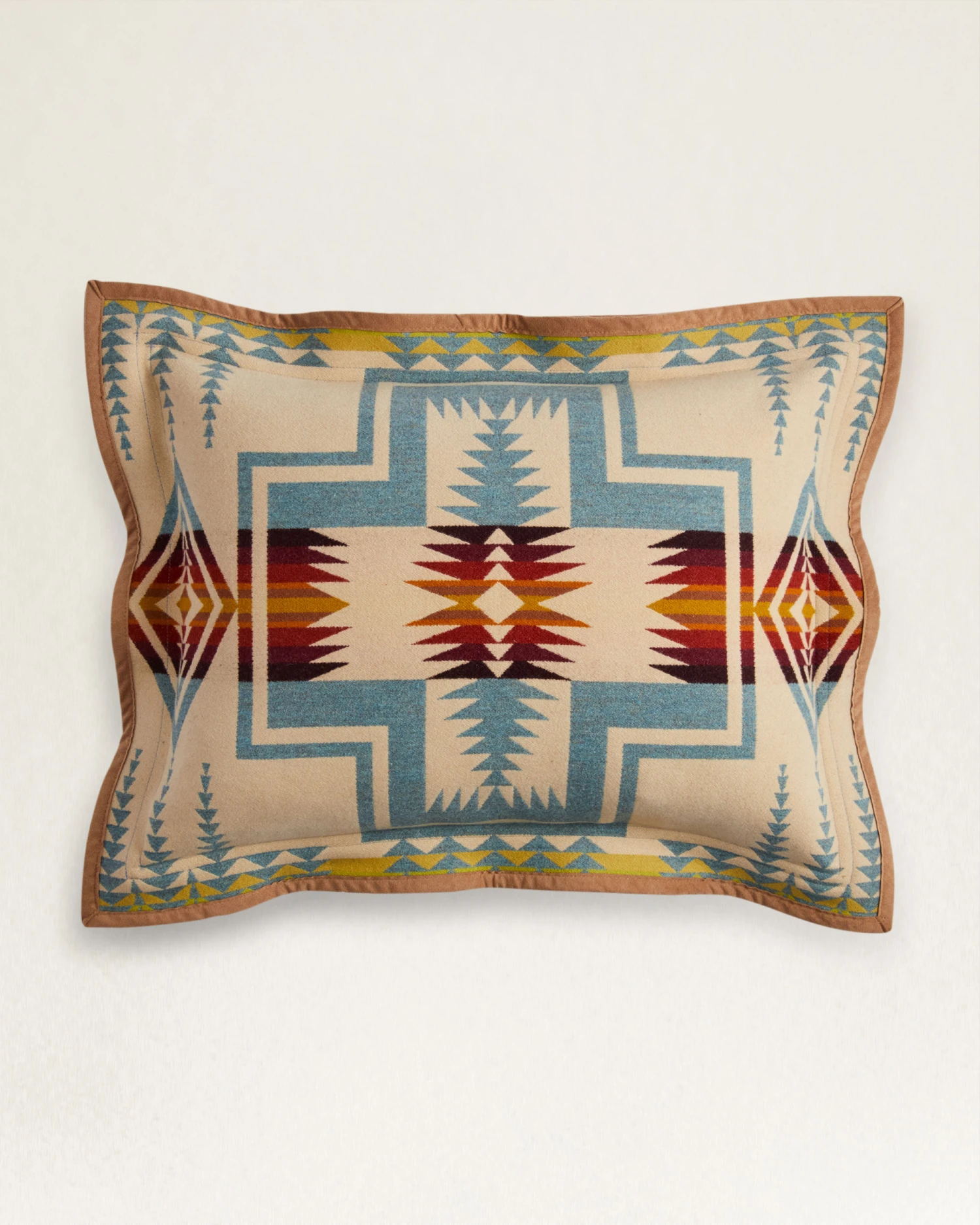A wool pillow sham made in America with a story dating back nearly a century. In 1923, President Warren Harding and his wife came west to dedicate a portion of the old Oregon Trail. At the ceremony, local Cayuse and Umatilla chiefs presented the first lady with a Pendleton shawl inspired by our famous Chief Joseph blanket. This dynamic design was an instant hit and remains in production today, still woven in our Northwest mills. Pair with matching blanket (item 70056).