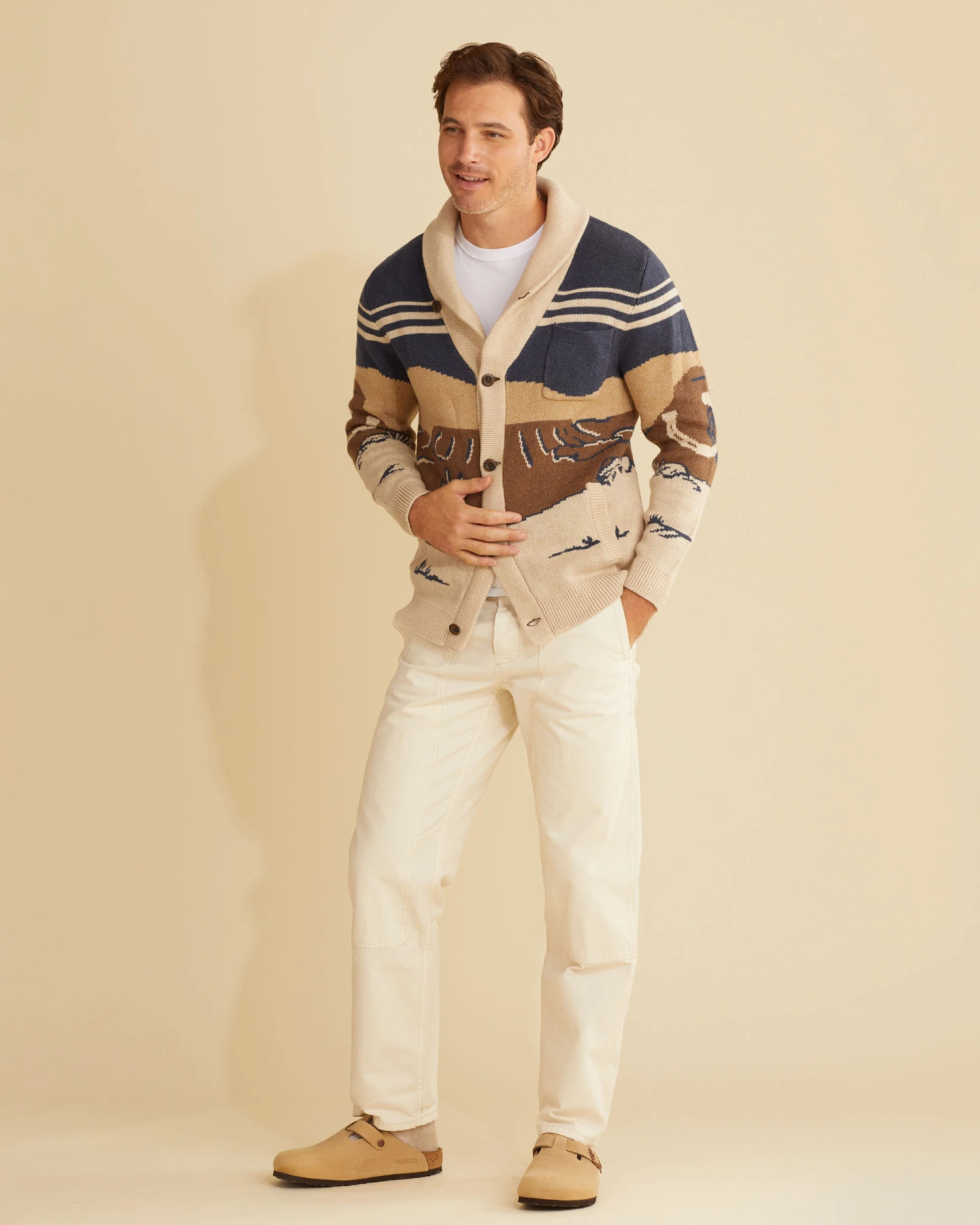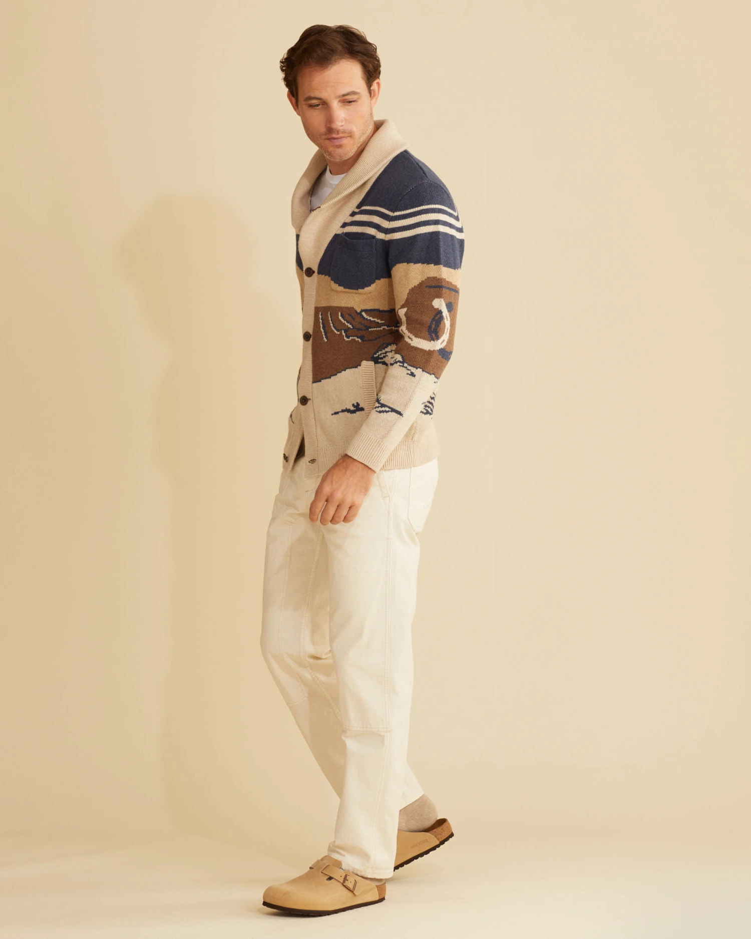 A Western-inspired scene is masterfully knit on this jacquard cotton cardigan, with outstanding pattern placement on the front, back and sleeves. Shawl collar, two welt pockets, faux horn buttons.