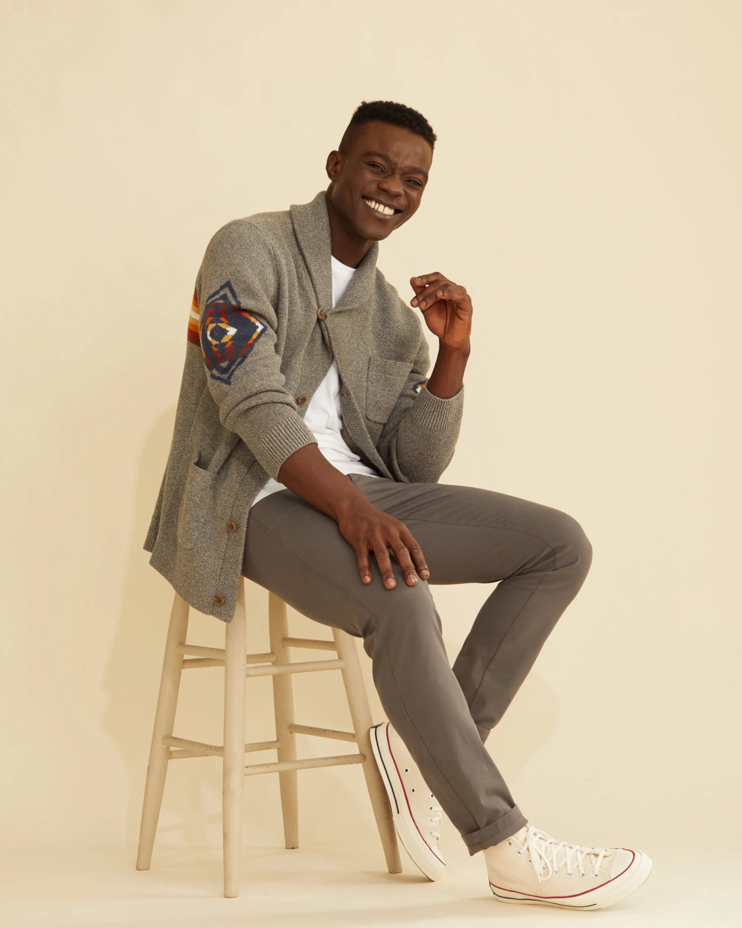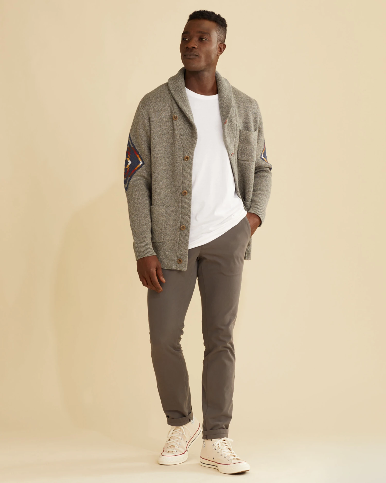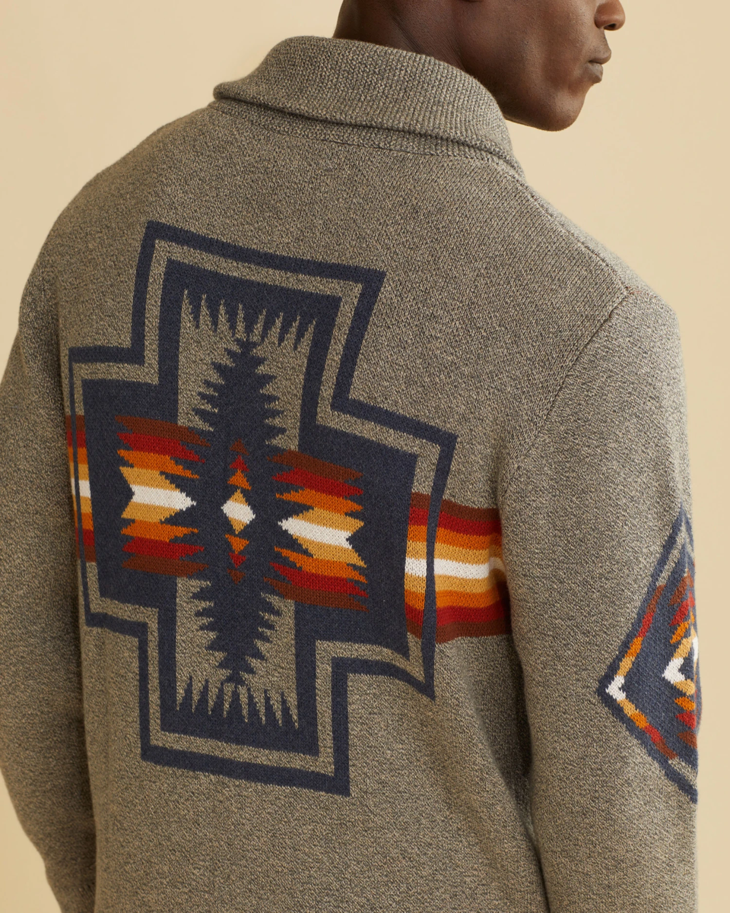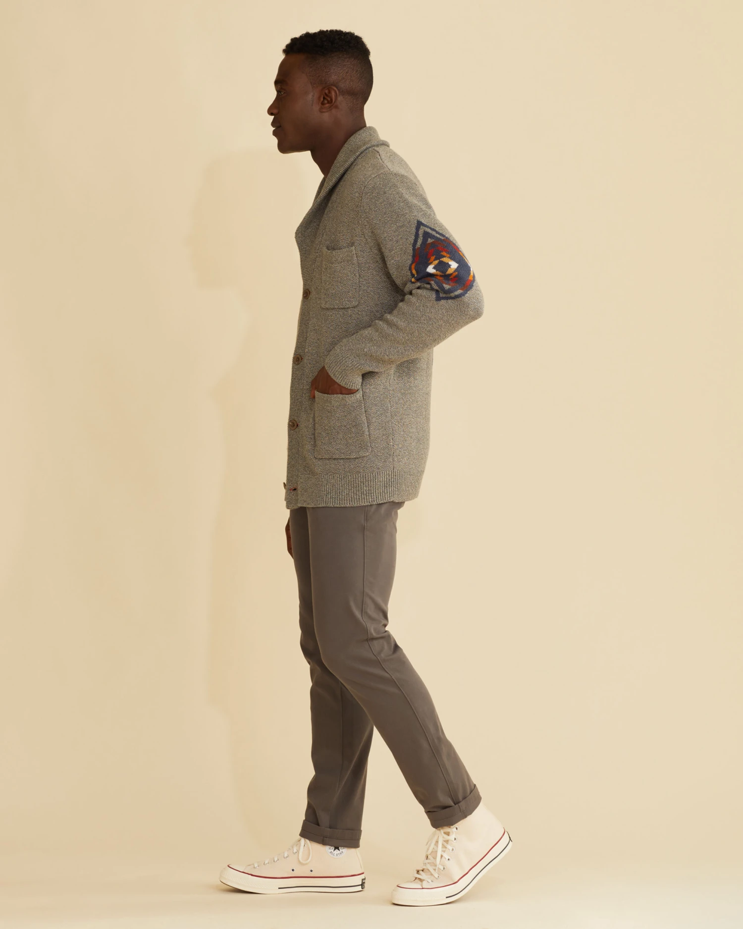 Men’s cardigan crafted of pure cotton in a mid-weight knit, for breathable comfort any time of year. Solid front with patterned sleeves; back features our historic 1923 Harding pattern. Three pockets; ribbed shawl collar, cuffs and hem.