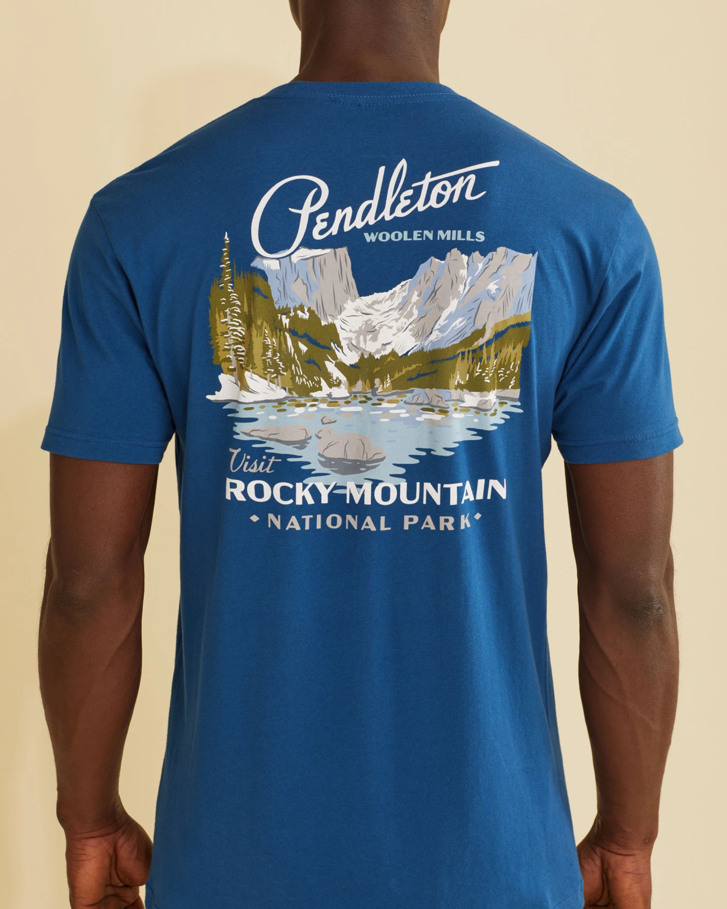Soft, combed cotton T-shirt with a vintage-inspired scene of Colorado’s Rocky Mountain National Park on the back, with a small Pendleton logo on the front left chest.