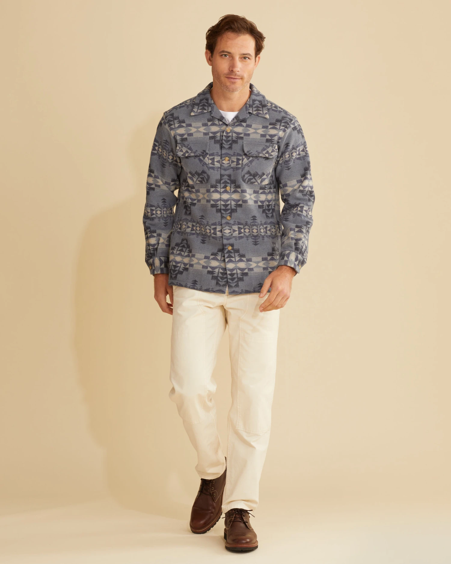 Our classic Board Shirt in a special jacquard fabric, woven in our Pendleton, Oregon, mill using 100% Umatilla® wool sourced from local ranchers. This wool fabric is naturally water-, stain- and odor-resistant—breathable, too—making this shirt an all-season favorite. Two bias-cut flapped chest pockets, straight hem.
