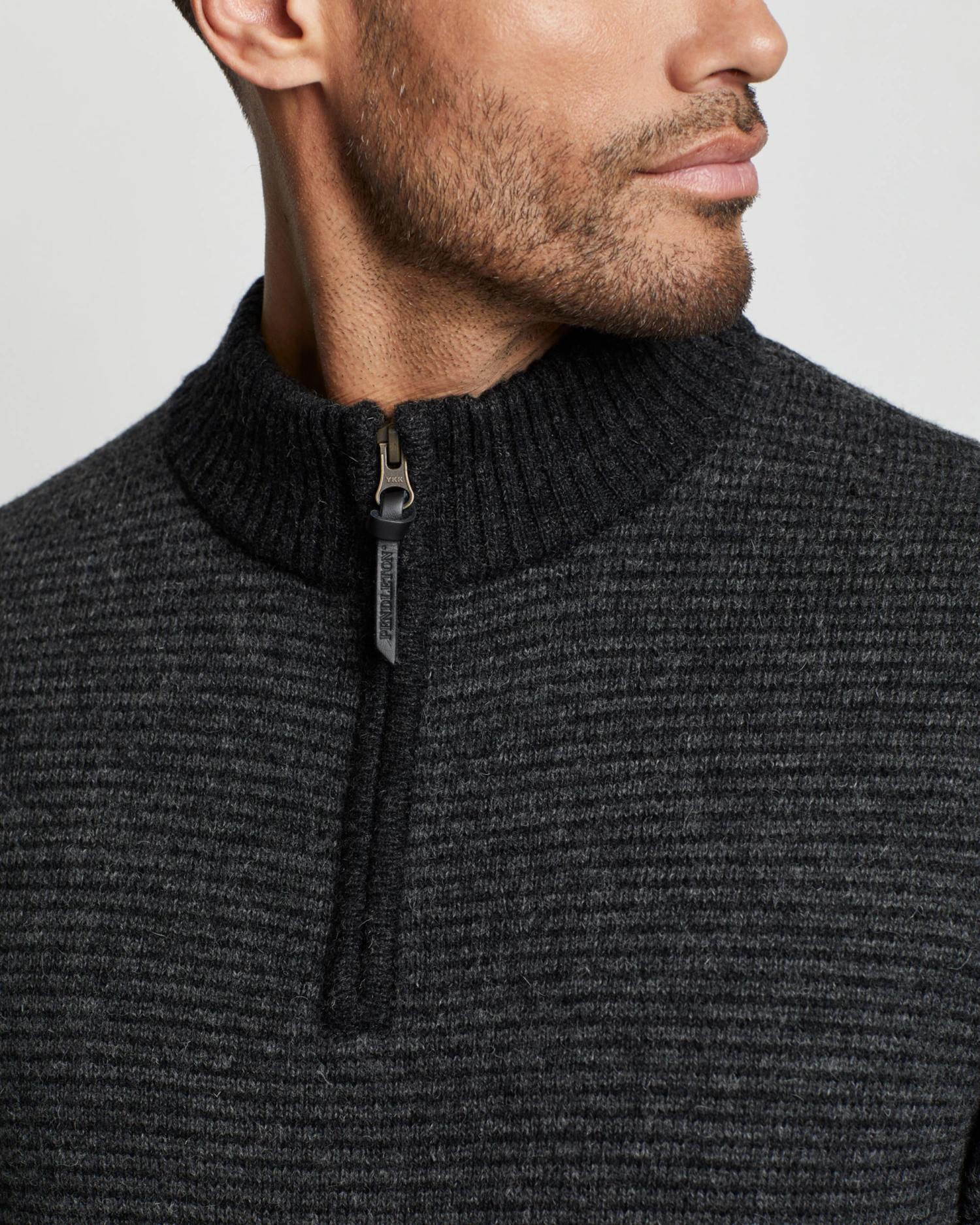 Pullover sweater knit with pure wool sourced from New Zealand. Mock neck, zipper with leather pull. As a bonus, this sweater is machine washable.