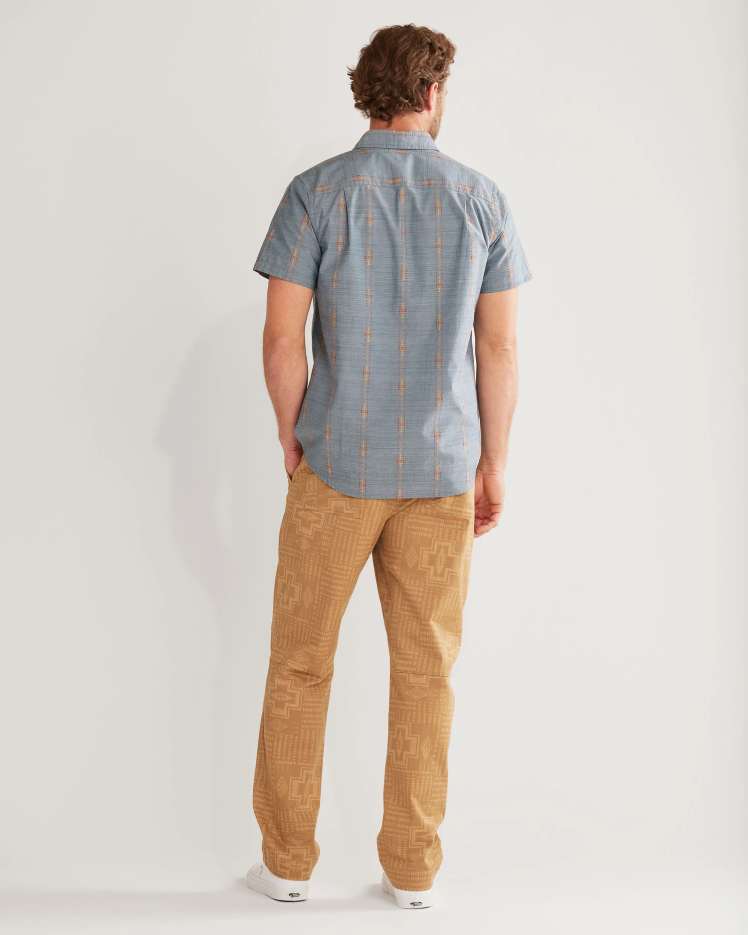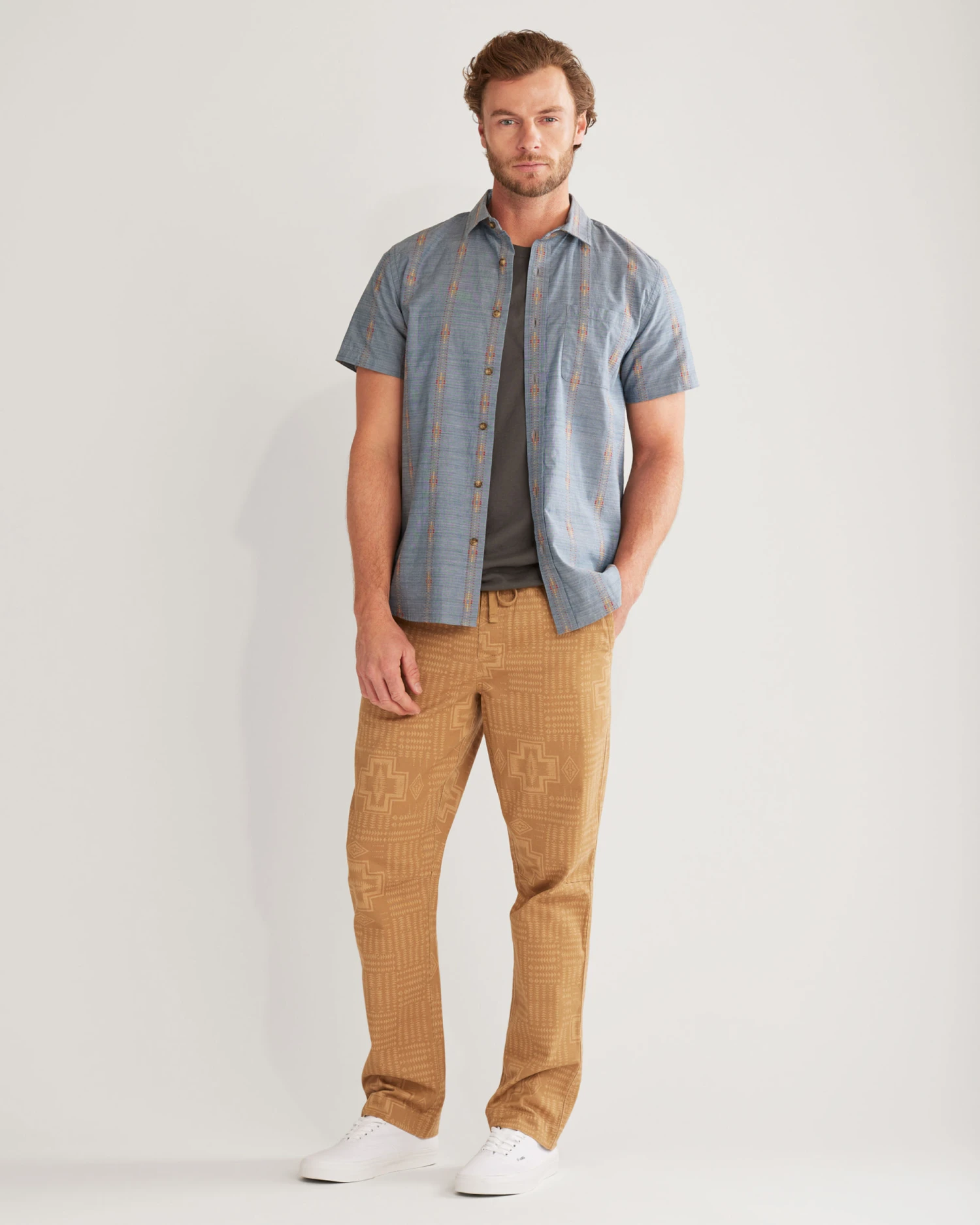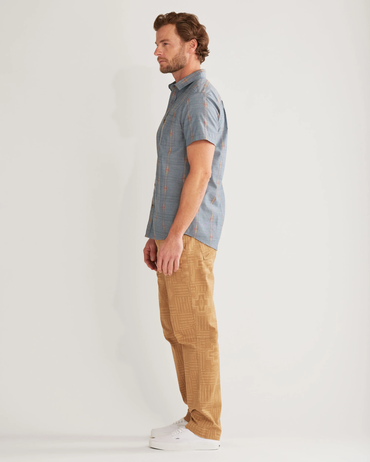 Lightweight cotton men’s shirt in a dobby weave with jacquard-inspired motifs. Spread collar, one matched open chest pocket, shirttail hem.