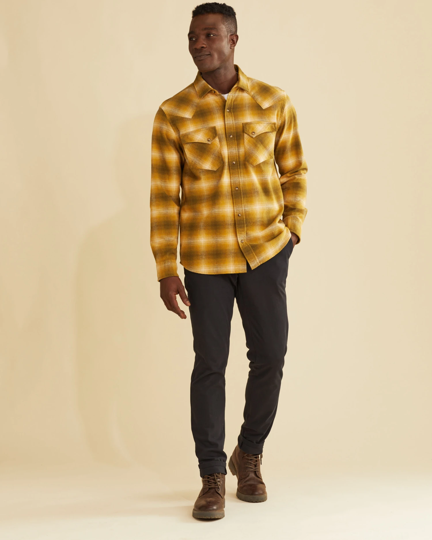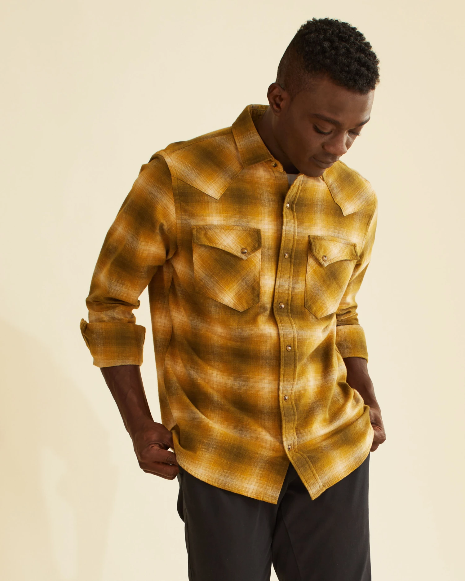 Inspired by our vintage Gambler button-down, this piece of iconic Westernwear features classic snap closures and distinct peaked front and back bias-cut yoke details. Woven from machine-washable soft and breathable cotton. Angled bias pockets, shirttail hem.