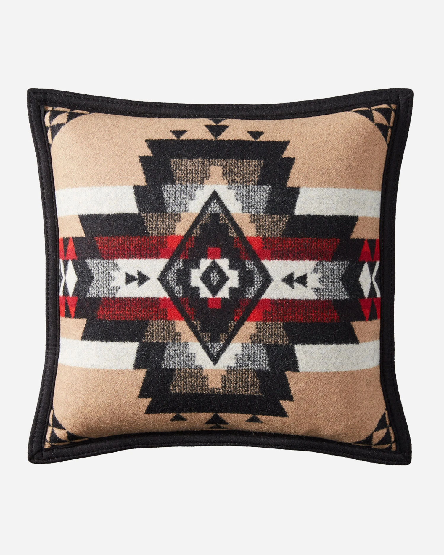 A made-in-USA wool pillow in a geometric pattern that matches our Rock Point Saddle Blanket (item 74251). Feather fill.
