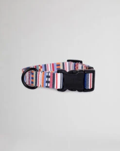 For the stylish pup: an adjustable USA-made collar featuring our exclusive stripes, crafted from sturdy recycled polyester webbing with a YKK buckle and D-ring for tags.
