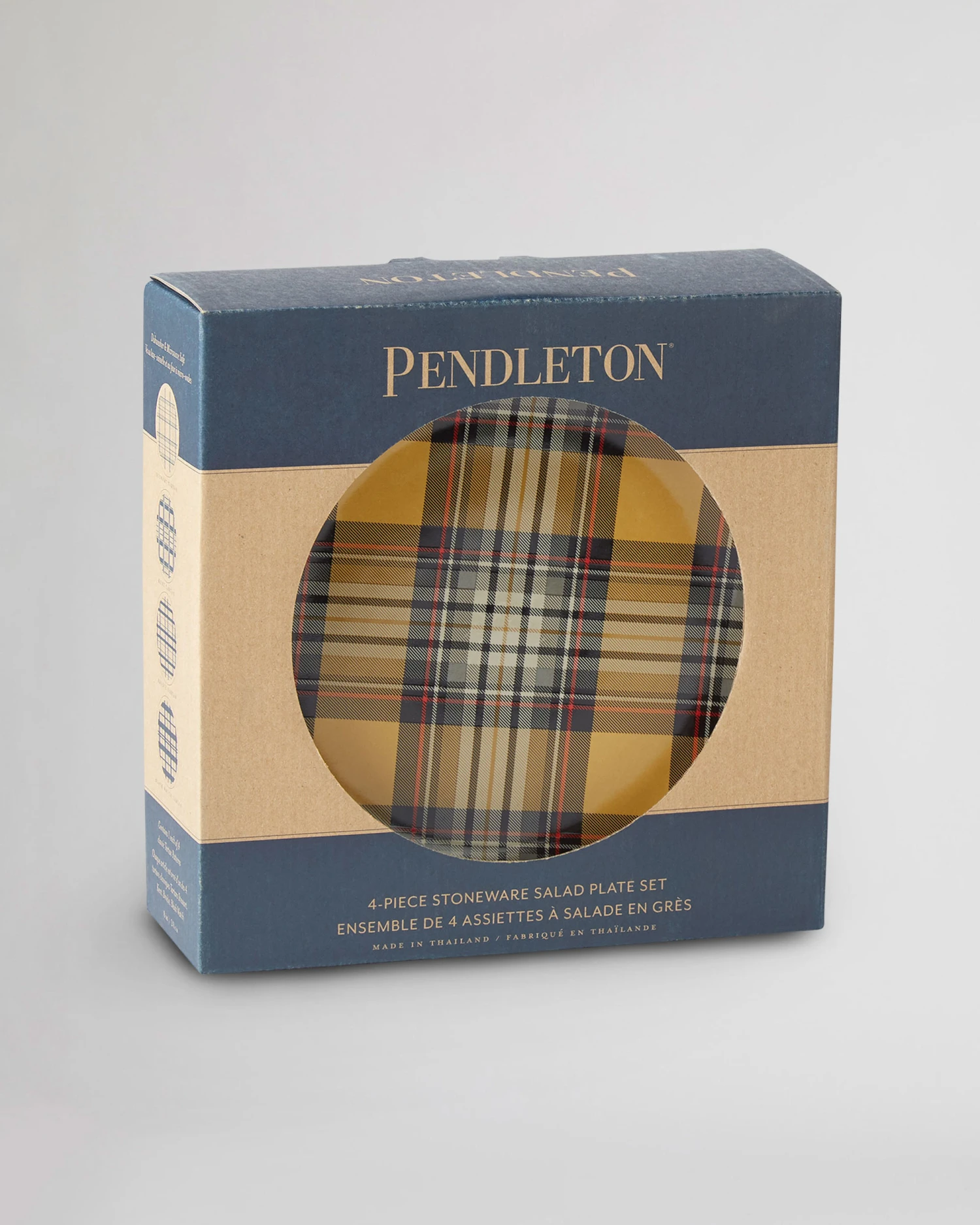 Set of four durable stoneware plates, each featuring a different tartan pattern. Gift boxed.