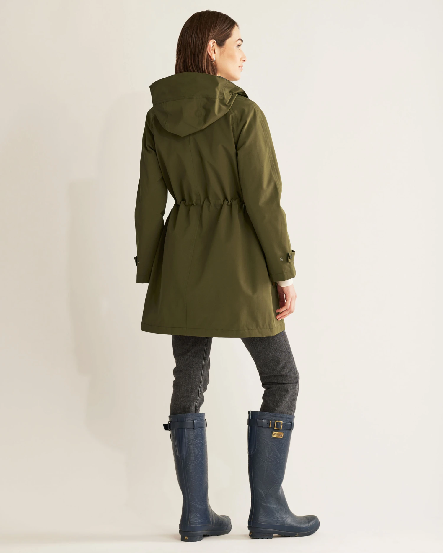 Women’s water-resistant trench has a zipper/snap closure, layback hood and adjustable drawcord at waist. Six pockets: two handwarmer pockets. two lower patch pocket and two side entry pockets. Hood and placket feature a patterned lining.