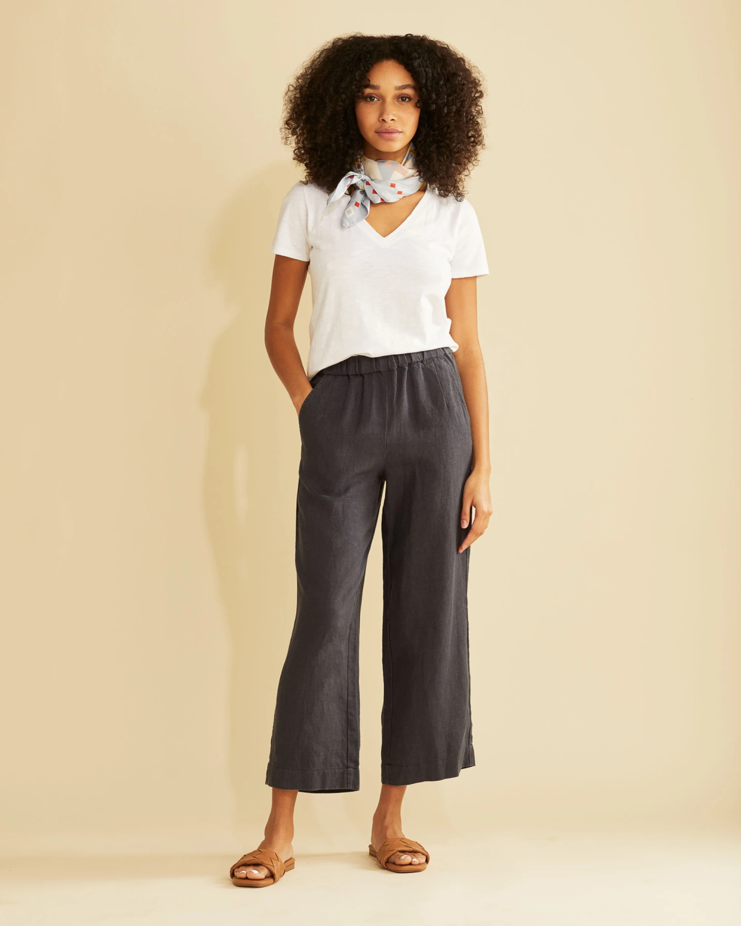 The perfect warm-weather pants tailored from cool, breathable linen with a contemporary wide-leg, cropped silhouette and comfortable pull-on elastic waistband. Two side slash pockets, two back patch pockets.