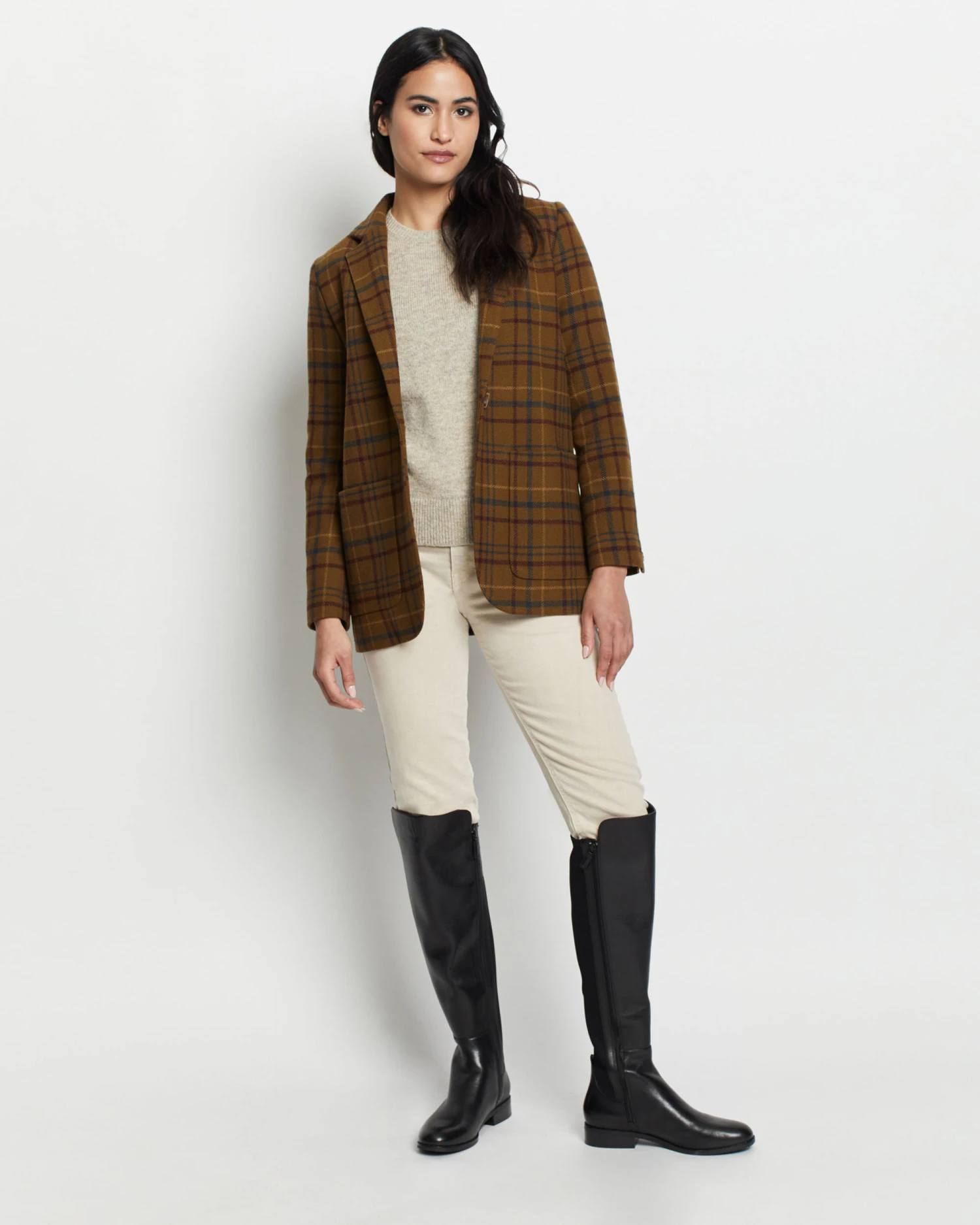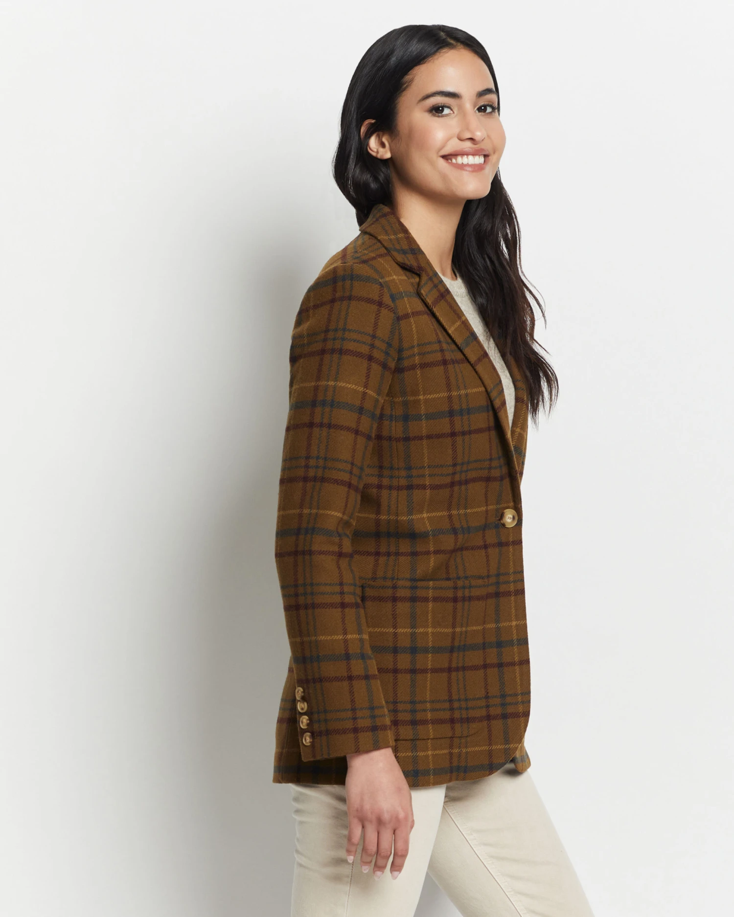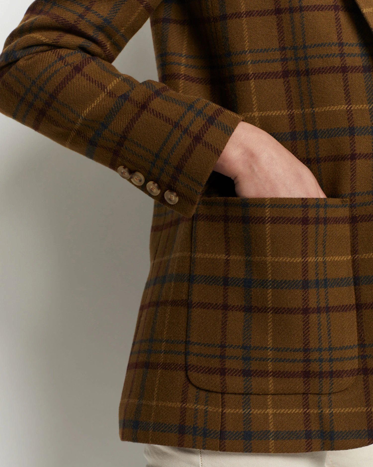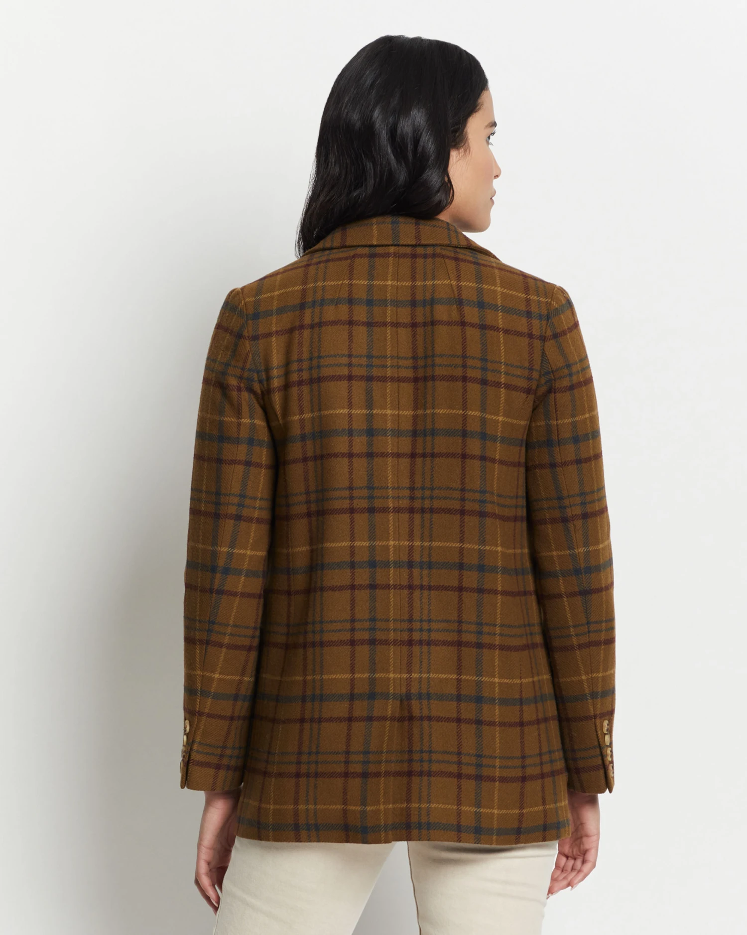 A modern take on a classic silhouette, crafted from soft, breathable wool in our classic plaid pattern. Features a single button front closure and two front pockets. Lined.