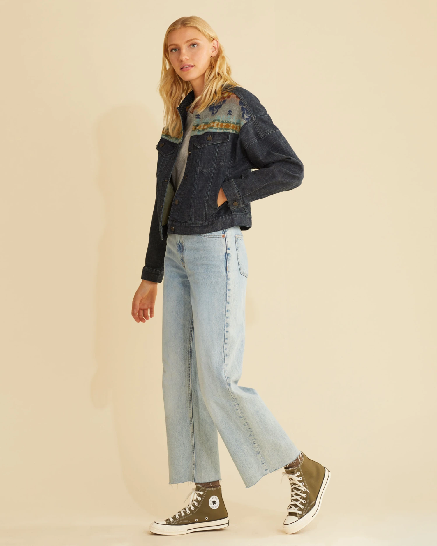 A women’s denim jacket with a distinctly Pendleton look, thanks to an intricate wool jacquard from our Pacific Northwest mills. Tailored in a modern oversized fit with signature logo buttons, chest pockets and onseam side pockets. Made of durable cotton with a hint of spandex for comfortable stretch. Long sleeves. Unlined.