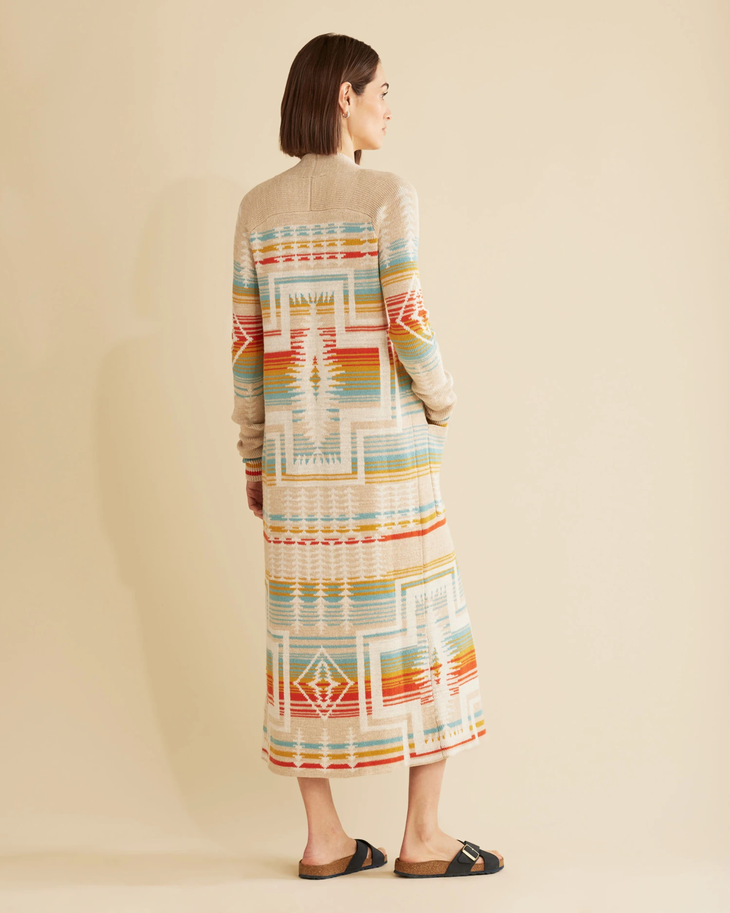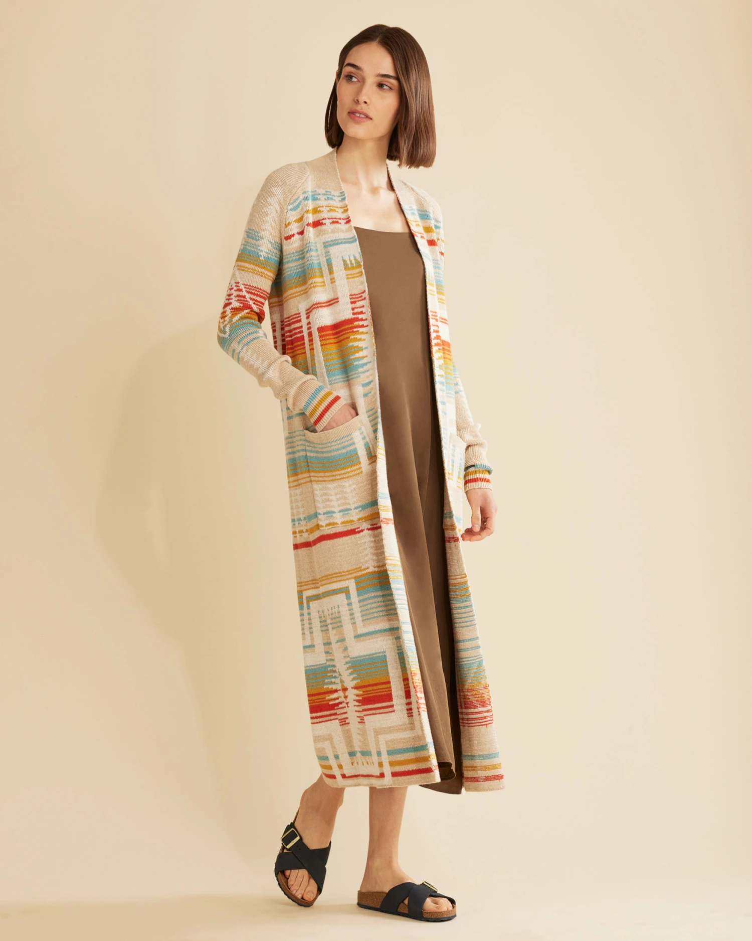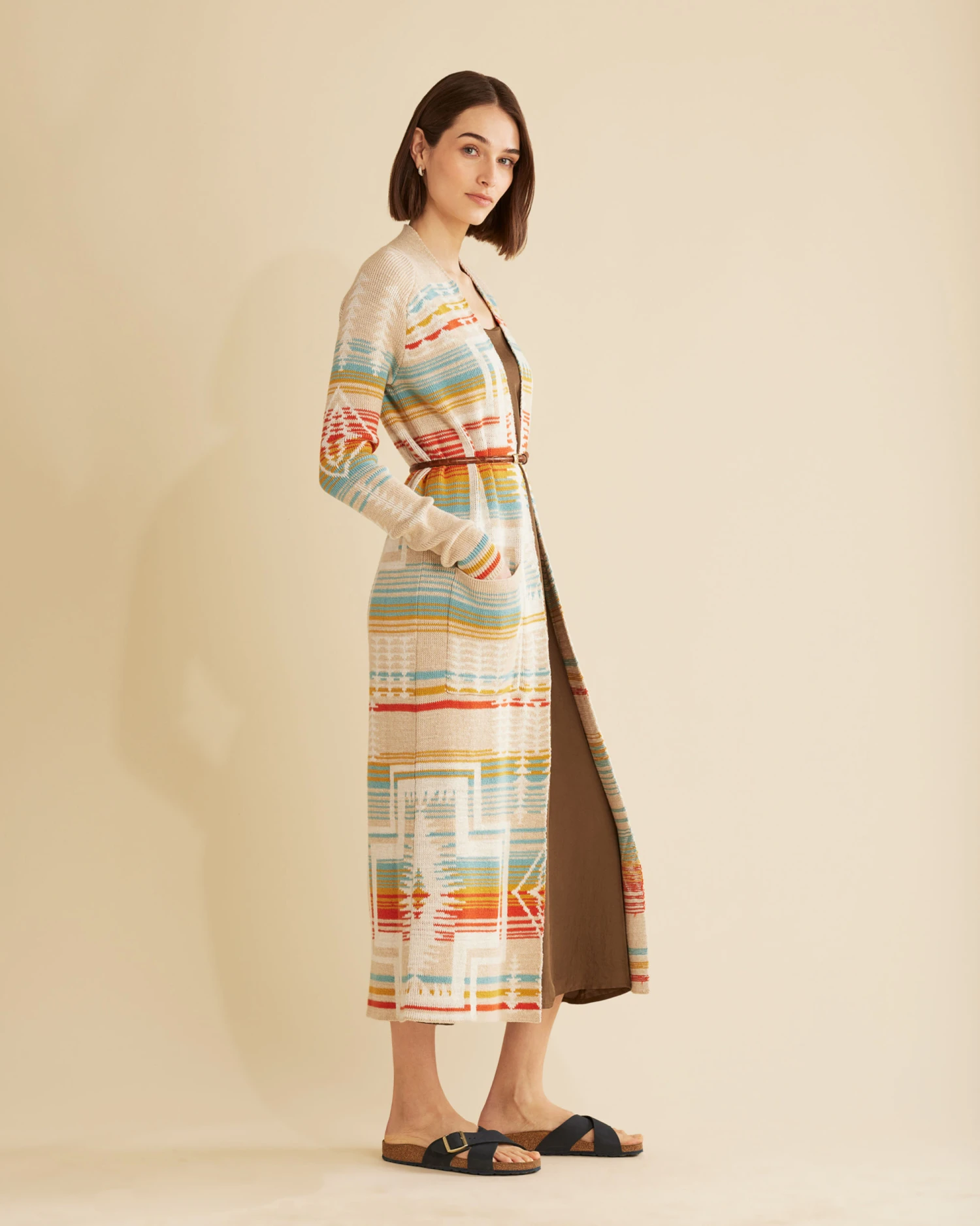 A long, duster-length cardigan with an eye-catching take on our bestselling Harding pattern. Crafted from soft cotton for lasting comfort and quality. Open front design with ribbed trim and two front pockets. Belt shown not included.