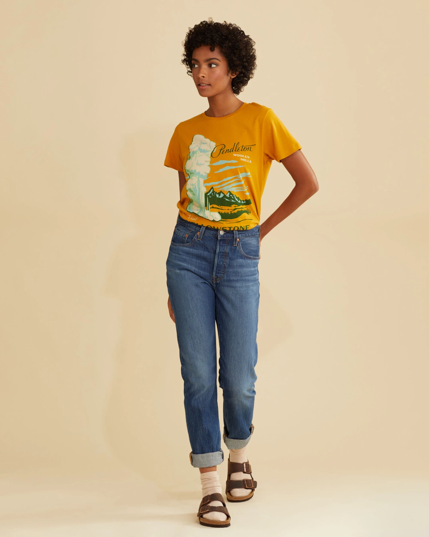 Women’s crewneck cotton tee with a graphic design that celebrates Yellowstone National Park. Knit from combed cotton that’s even softer and more durable than regular cotton. Short sleeves.