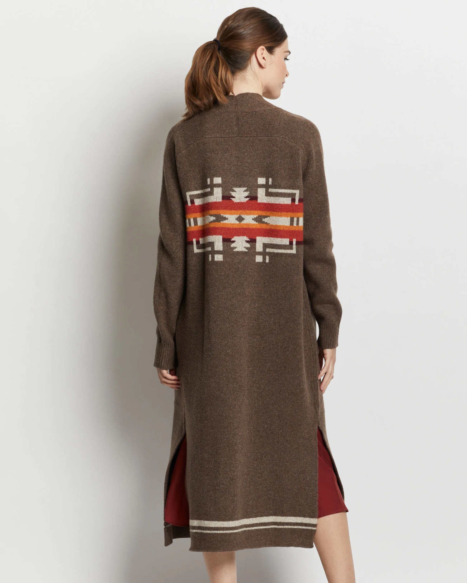 A long, duster-length cardigan with simple yet eye-catching design, crafted from ultra-soft lambswool for lasting comfort and quality. Open front design with ribbed trim and two front pockets.