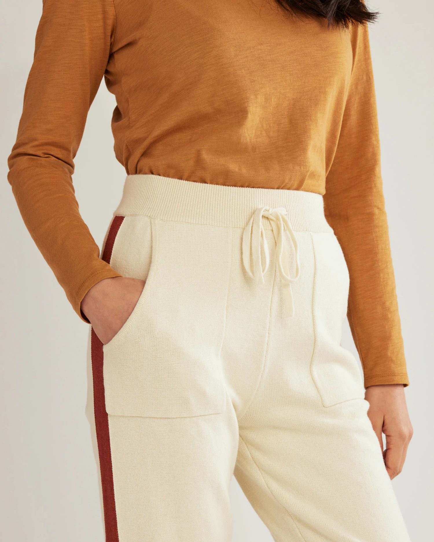 Lounge comfortably in these soft pull-on joggers, knit from lightweight cotton with a touch of cashmere. Relaxed fit with drawstring waist, front pockets and a contrasting stripe for a sporty touch.
