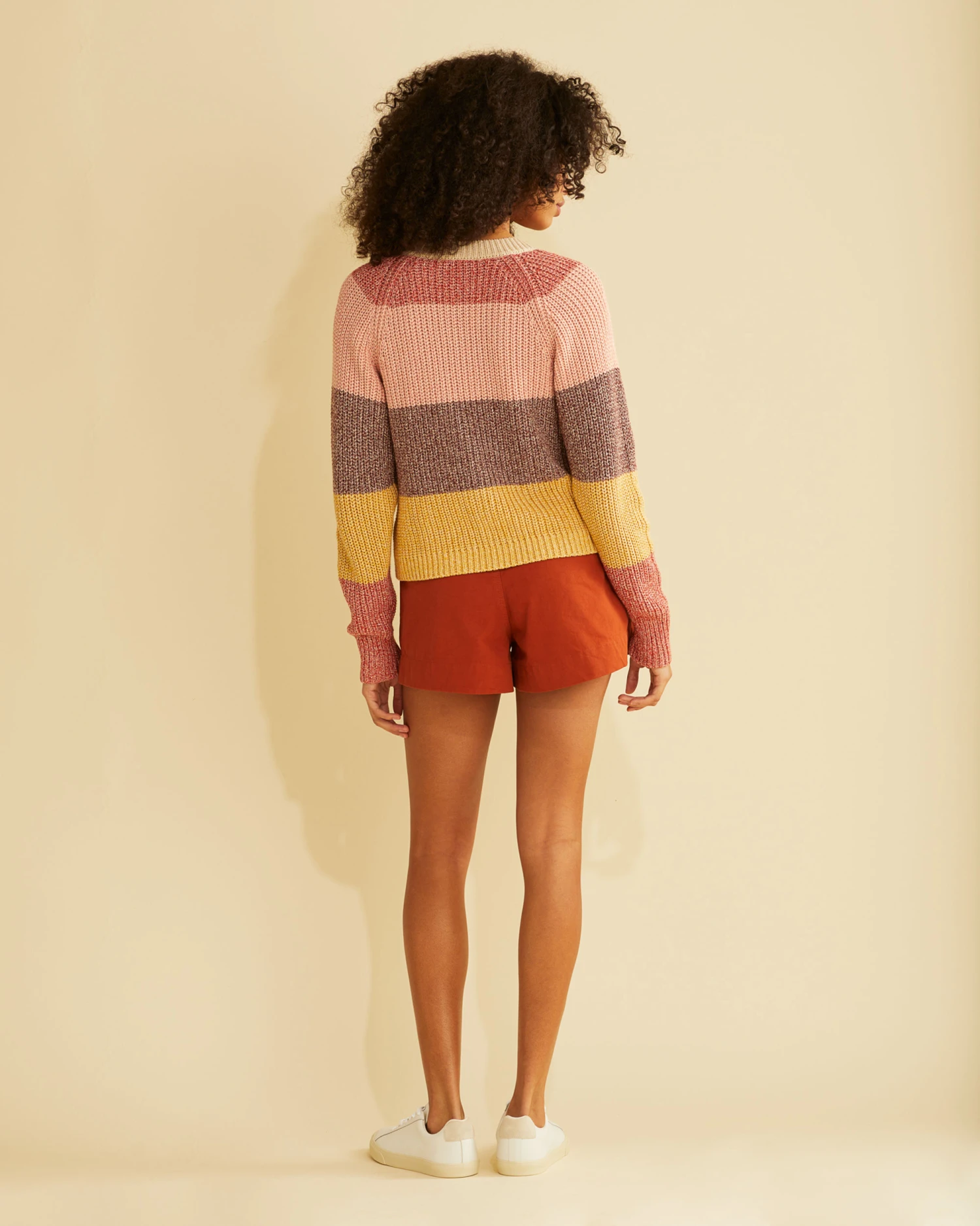 Bold stripes in a palette of soft sunset tones give this sweater spring-through fall appeal. Knit from pure cotton in a lightly textured ribbed stitch, with a button front and raglan sleeves.