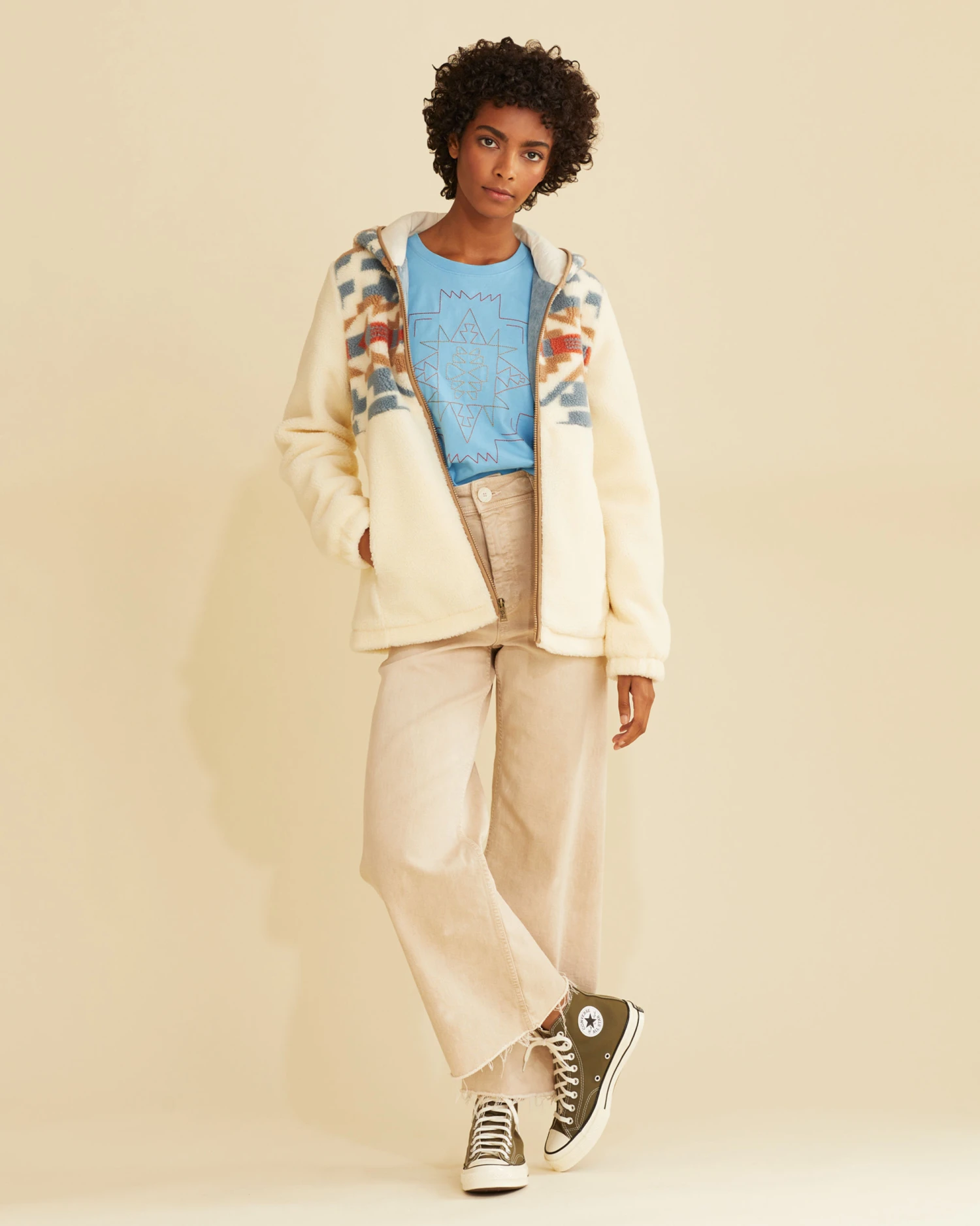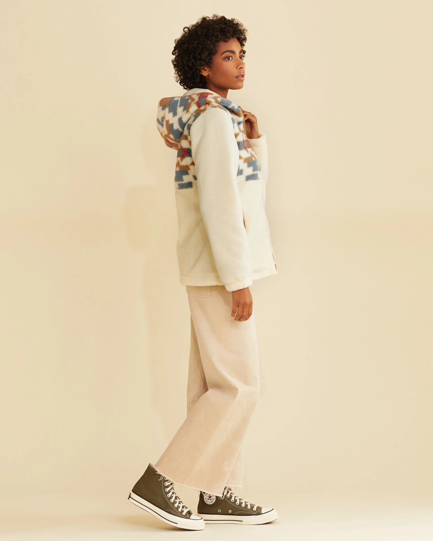 Hooded, zip-front jacket in soft, spring-weight Berber fleece with a breathable cotton body lining and polyester-lined sleeves for easy on-and-off. Two exterior pockets and one interior patch pocket.