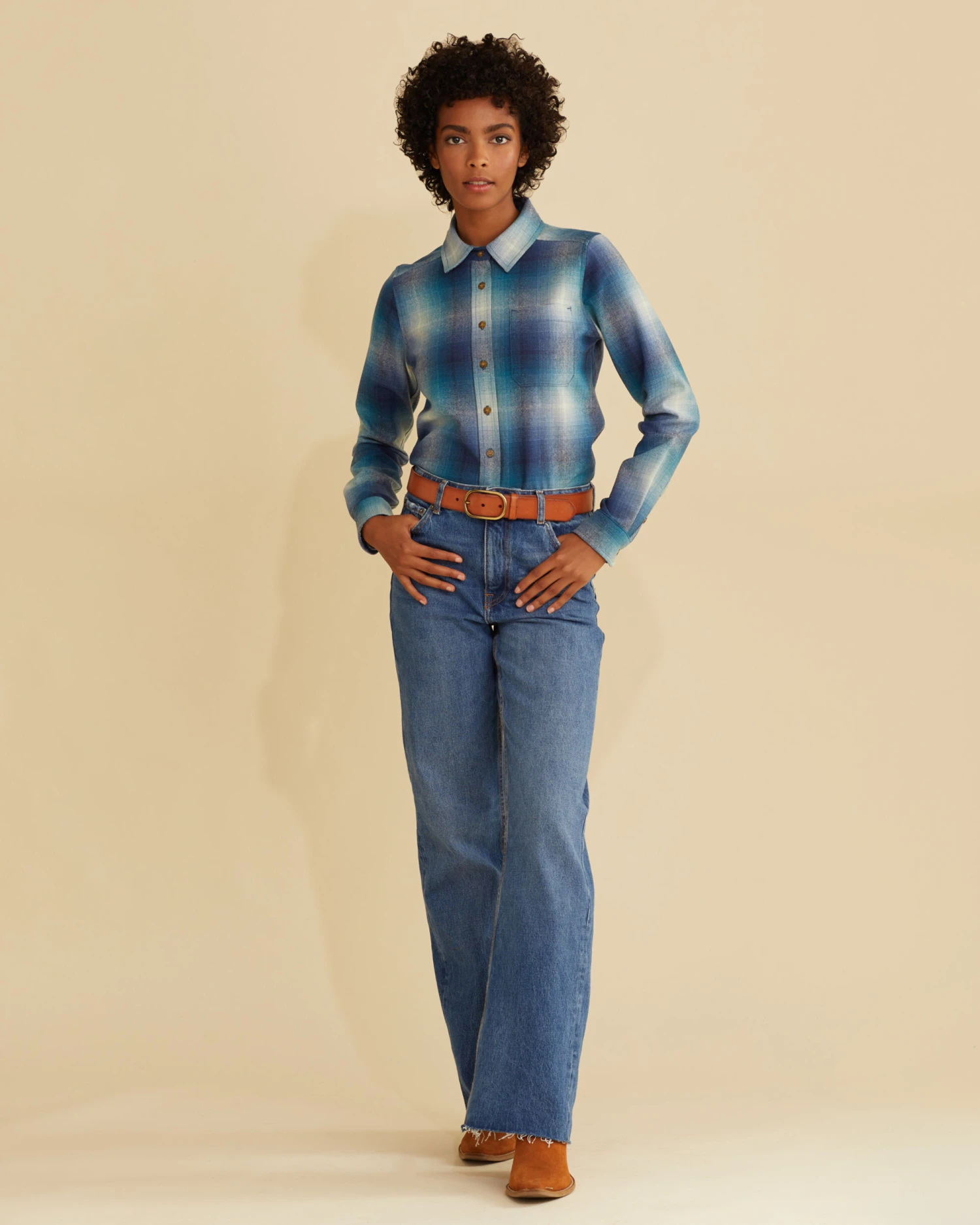 A long-sleeve women’s shirt made from our own Umatilla® wool, a midweight weave with a flannel-like hand. Warm, but not heavy, it’s wrinkle-resistant and machine washable. Pattern-matched chest pocket, button cuffs, curved hem with side slits. Classic fit.