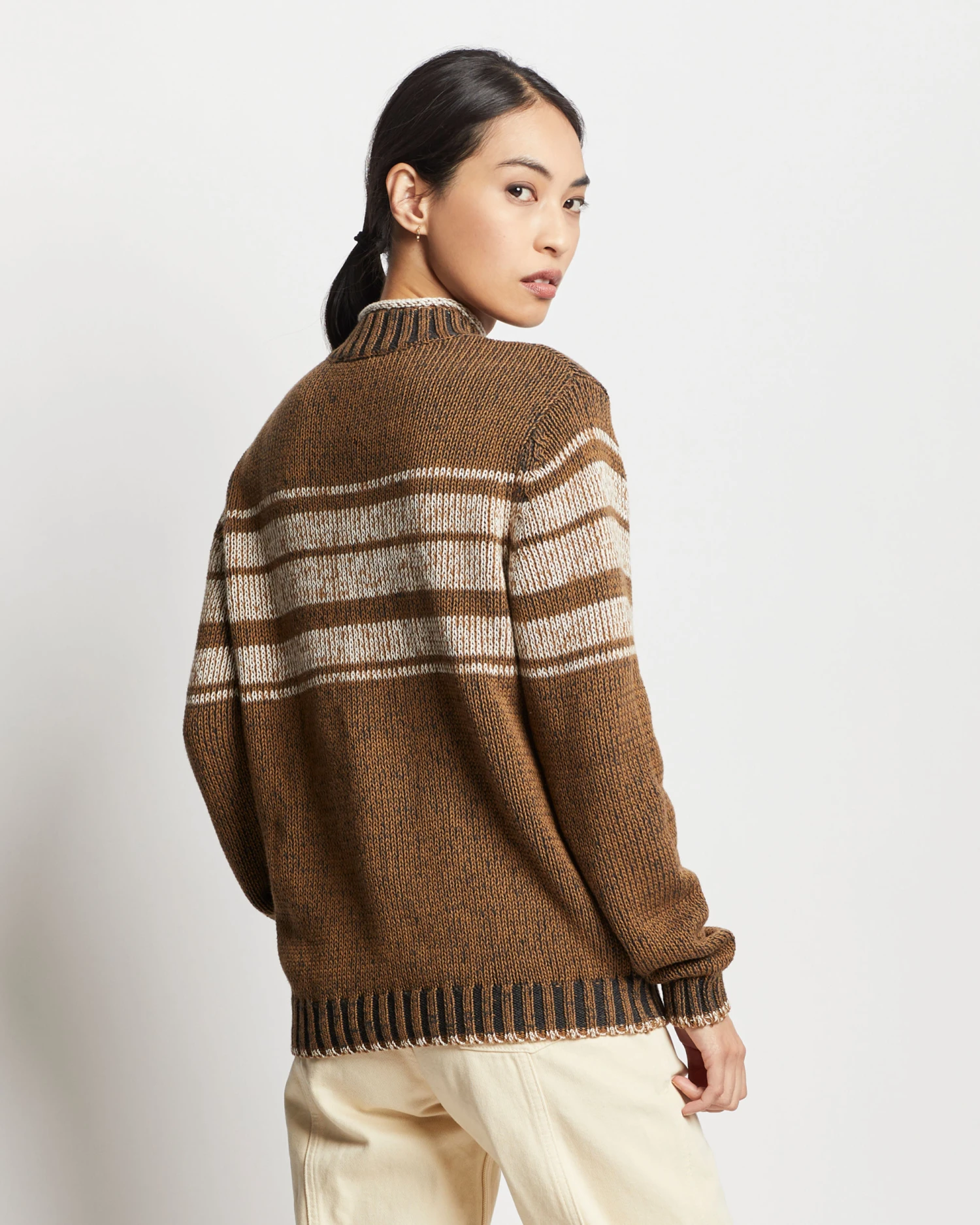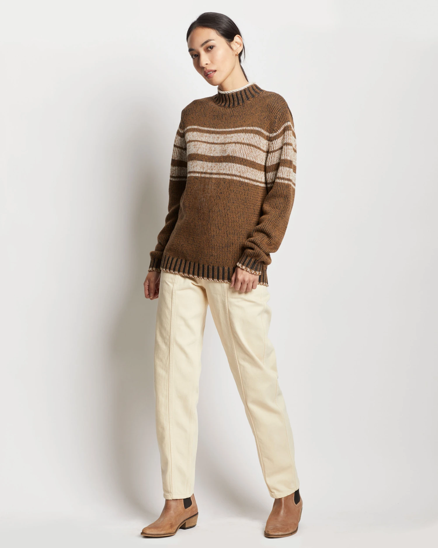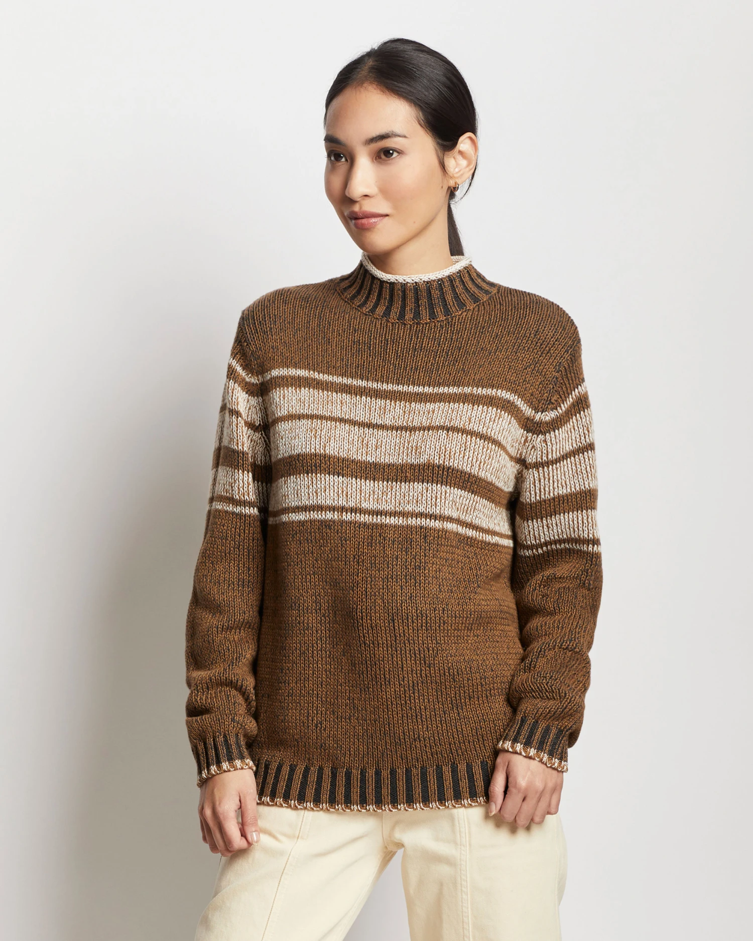 An all-cotton pullover sweater with a modern silhouette—from the mock neck to the blousy sleeves and body. Accented with textured, plaited stripes across the chest and sleeves, with color tipping at hem and cuffs.