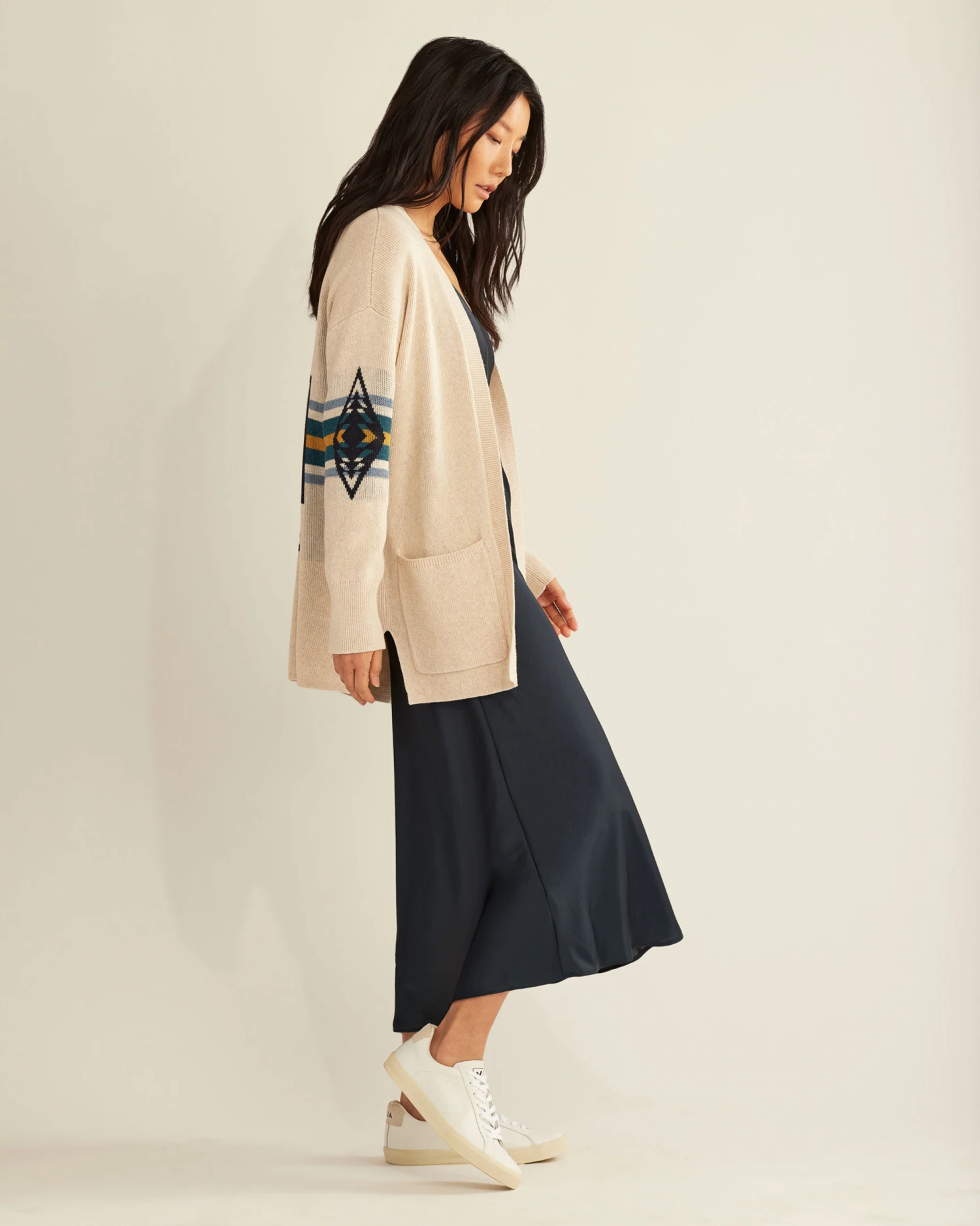 Women’s open-front cardigan sweater in a smooth birdseye knit, accented with our exclusive Harding pattern on back. Made from 100% cotton for breathability and year-round wear. Featuring a slightly oversized fit, with dropped shoulders, patch pockets and rib-knit trim. Long sleeves.