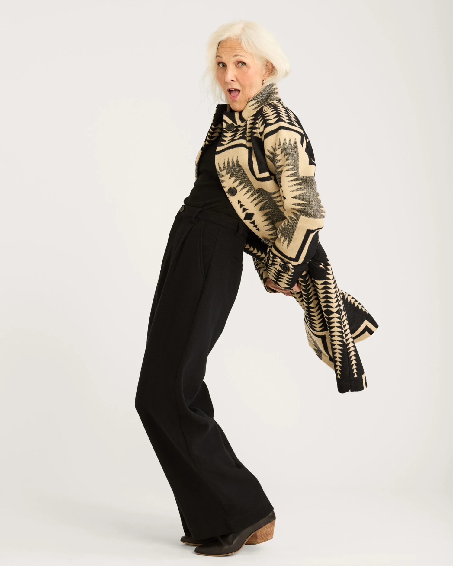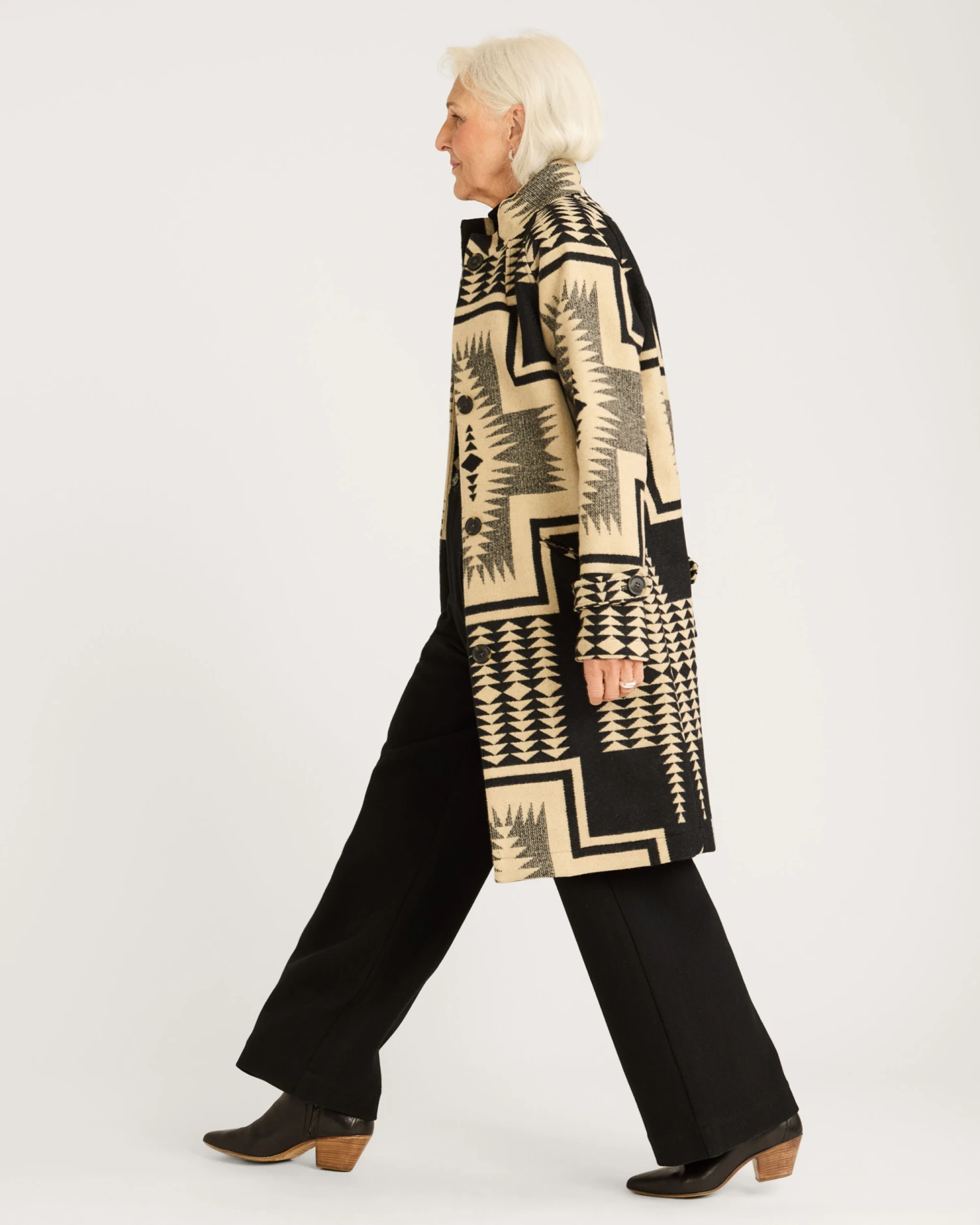 A women’s coat style directly from our archives, re-imagined for today in an updated fit. Made in the USA of our warm, blanket-weight Timberline jacquard fabric, with impeccable pattern matching across every seam. Button placket, patch front pockets and button-tab details at cuffs. Unlined interior with taped seams allows the beauty of the fabric to show through.