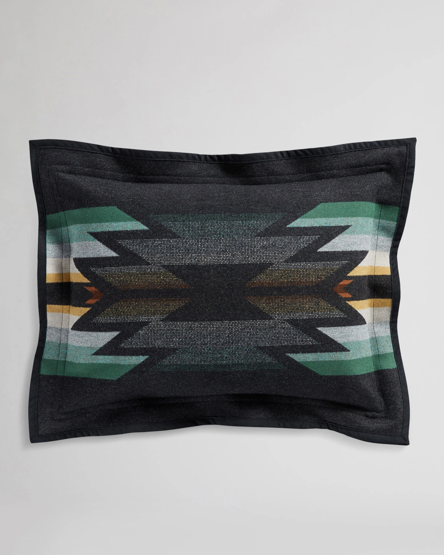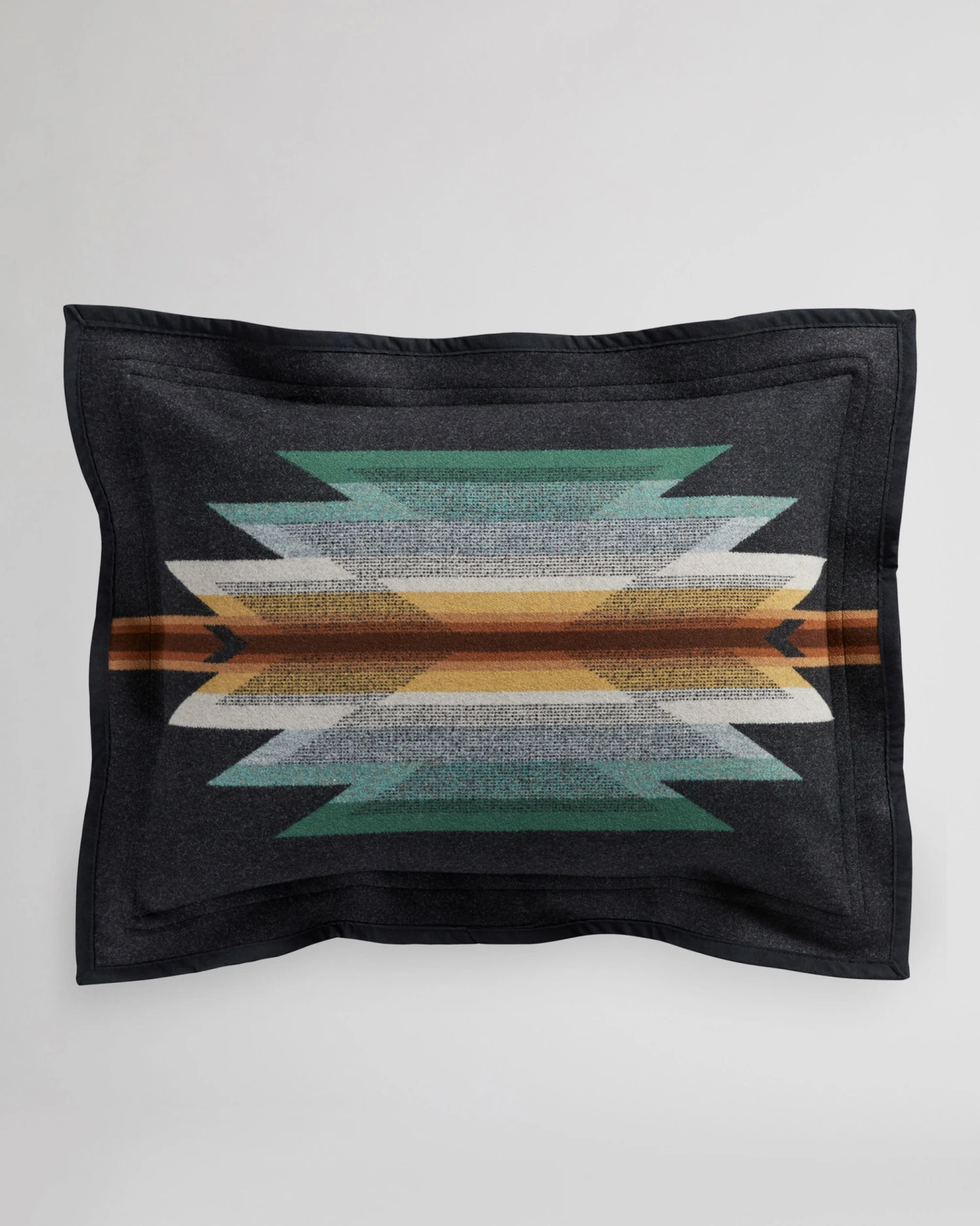 A USA-made wool sham that pairs beautifully with our matching blanket (item 77048). The pattern is inspired by the distinctive peaks, fertile valleys and pristine rivers along Oregon’s Wyeth Trail spanning 2,170 miles. Reverses for two different looks.
