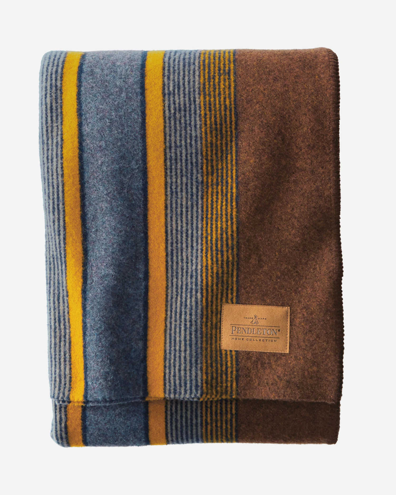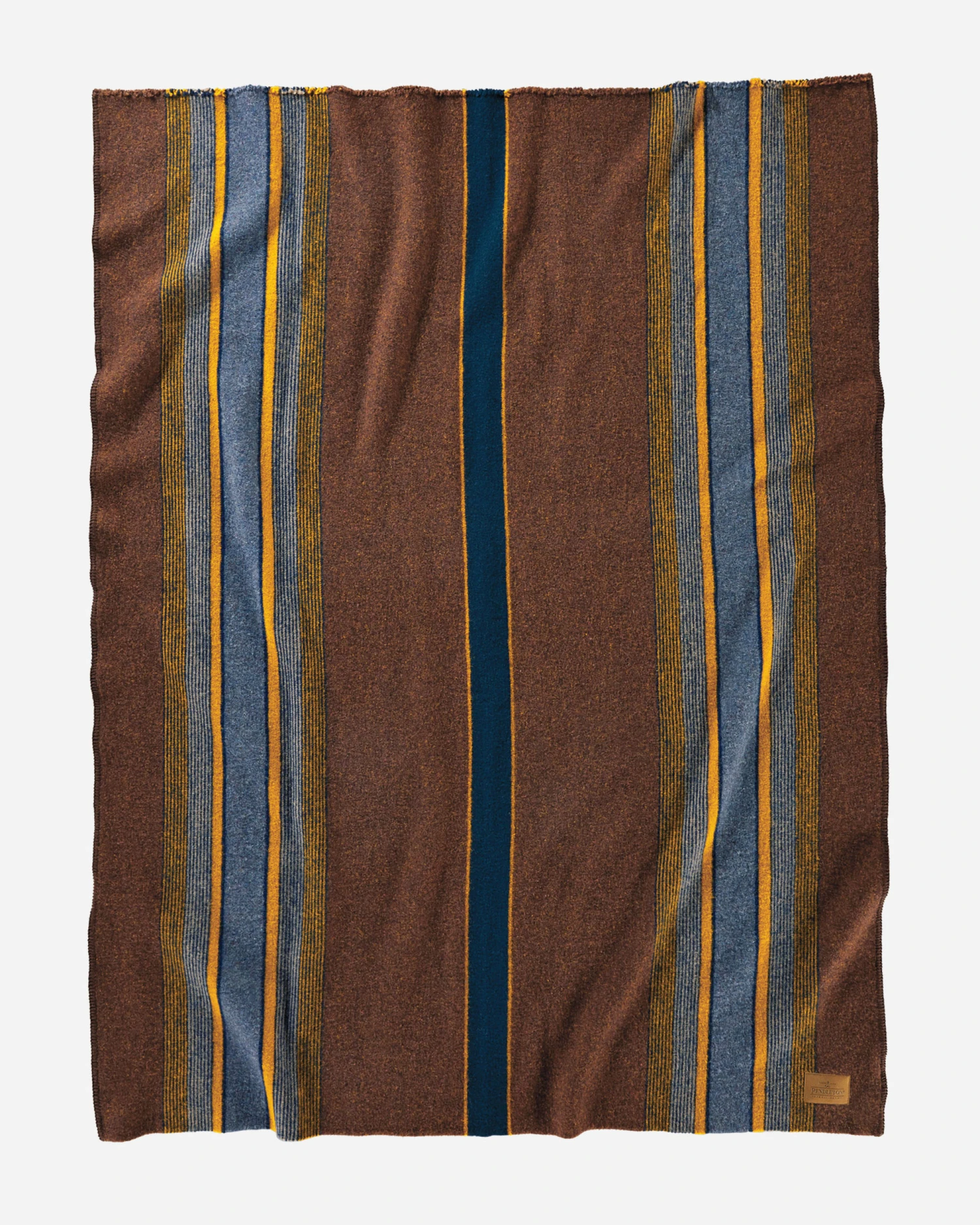 Made-in-America wool camp throw that’s one of our most popular. Camp blankets were originally used by shepherds to brave the elements of the Pacific Northwest—right where our rugged wool versions are still woven today. These smaller sized blankets make a great gift for outdoor enthusiasts. Stripes run vertically.