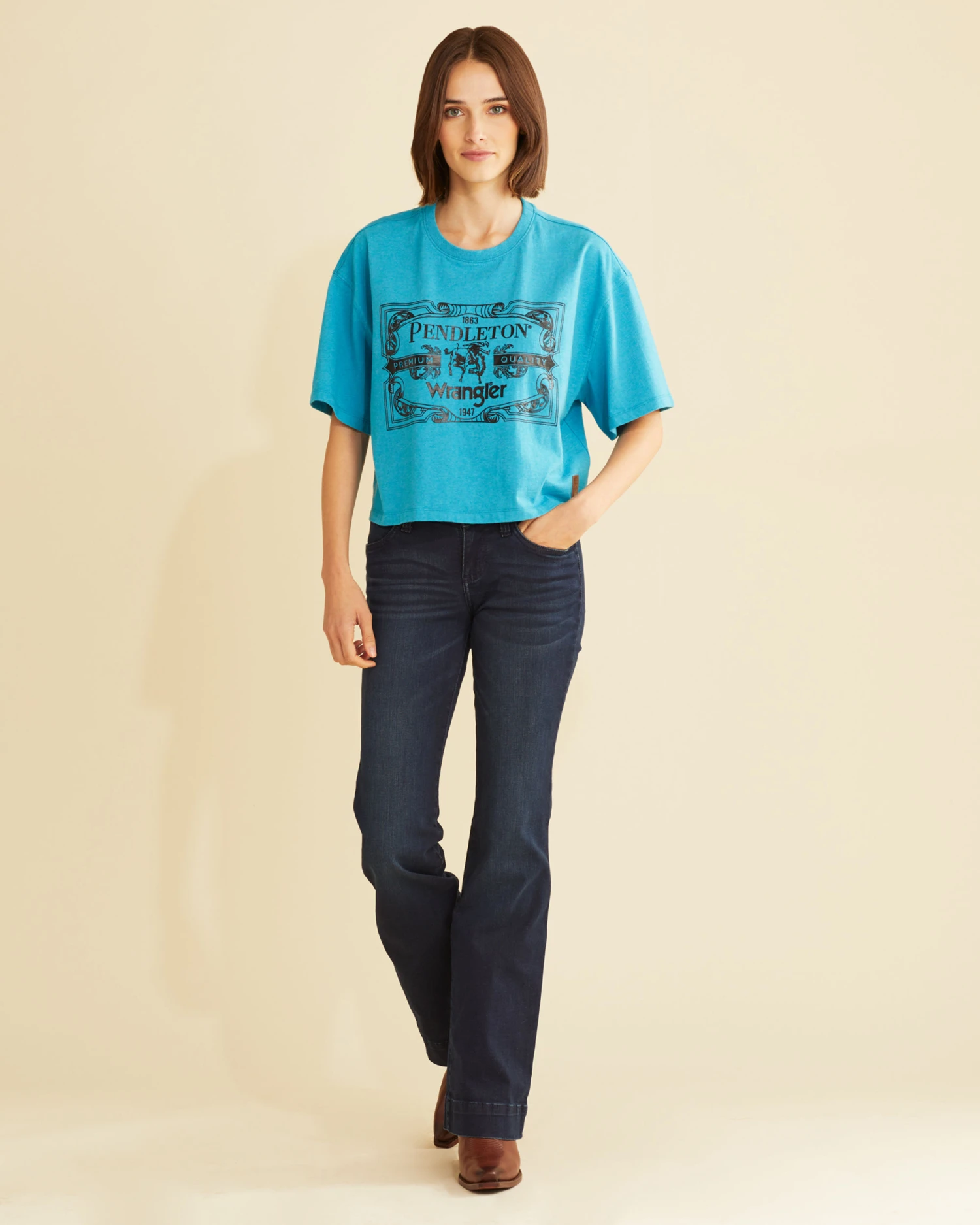 A women’s cotton tee in a vintage-inspired print that celebrates two iconic Western brands. Created through a collaboration with Wrangler® and Pendleton, it’s styled in a cropped, oversized silhouette that’s a perfect match for high-rise jeans. Short sleeves.